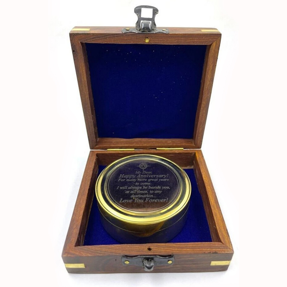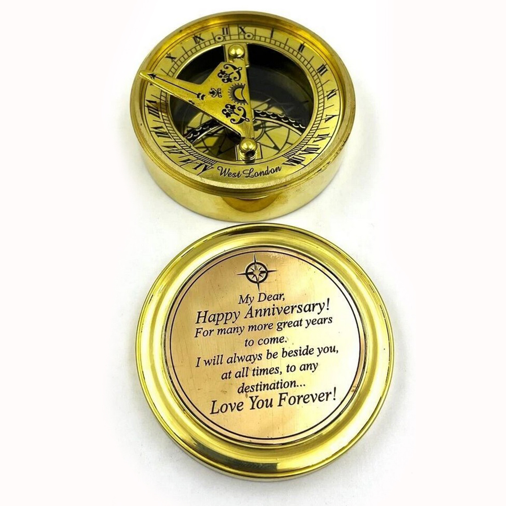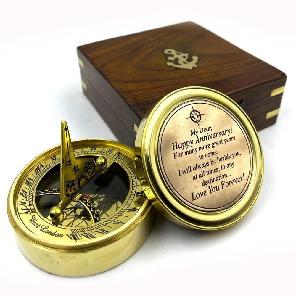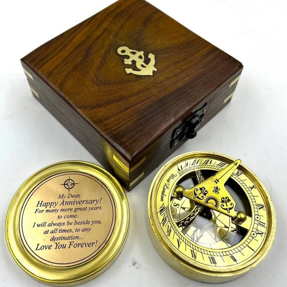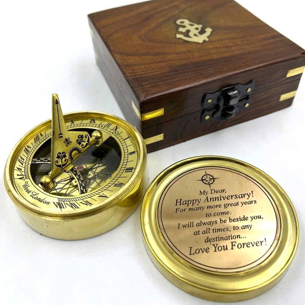 Celebrate timeless connection and meaningful journeys with this brass sundial compass gift featuring an engraved message and wooden presentation box. Crafted from solid brass, this piece blends traditional navigation and timekeeping elements with personal sentiment. The engraved inner lid carries a heartfelt anniversary message, transforming a classic nautical instrument into a lasting keepsake.