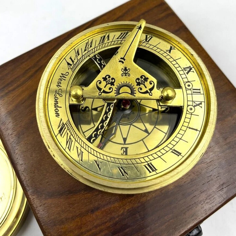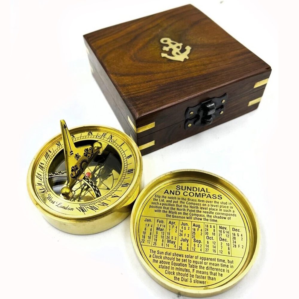 - Material: Solid brass sundial compass with wooden box