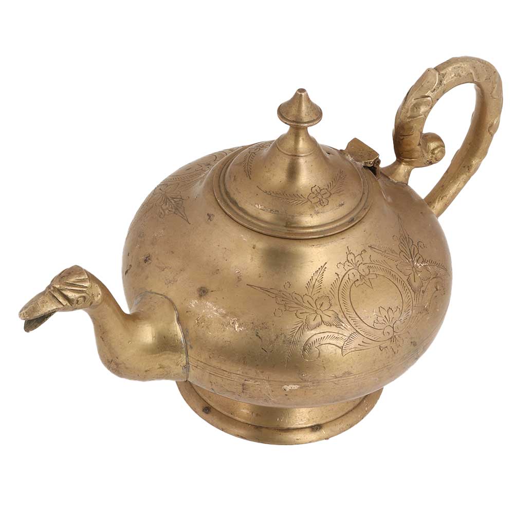 Brass Tea Pot Engraved Floral Design Islamic Style Pot with bird stout. This tea pot has designs embossed on it which makes it more attractive and it has a decorative handle and stout too. Use it as collectable or a personal gift to special someone.