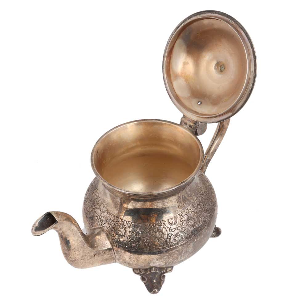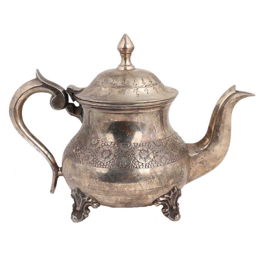 Handmade brass tea pot silv er polish with a big handle and lid carved with rare and unique floral design and decorative legs. Kitchen decoration, souvenir , hotel decoration. Use it as collectable or a personal gift to special someone.