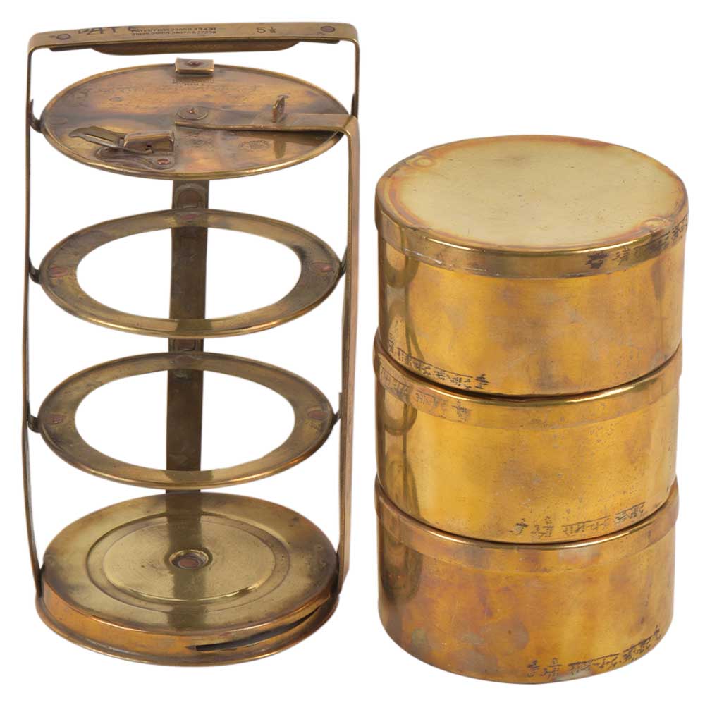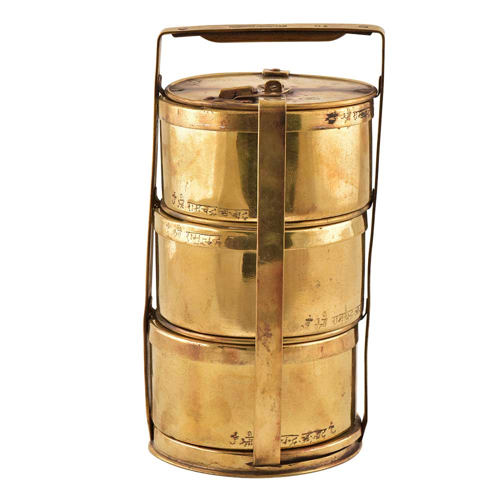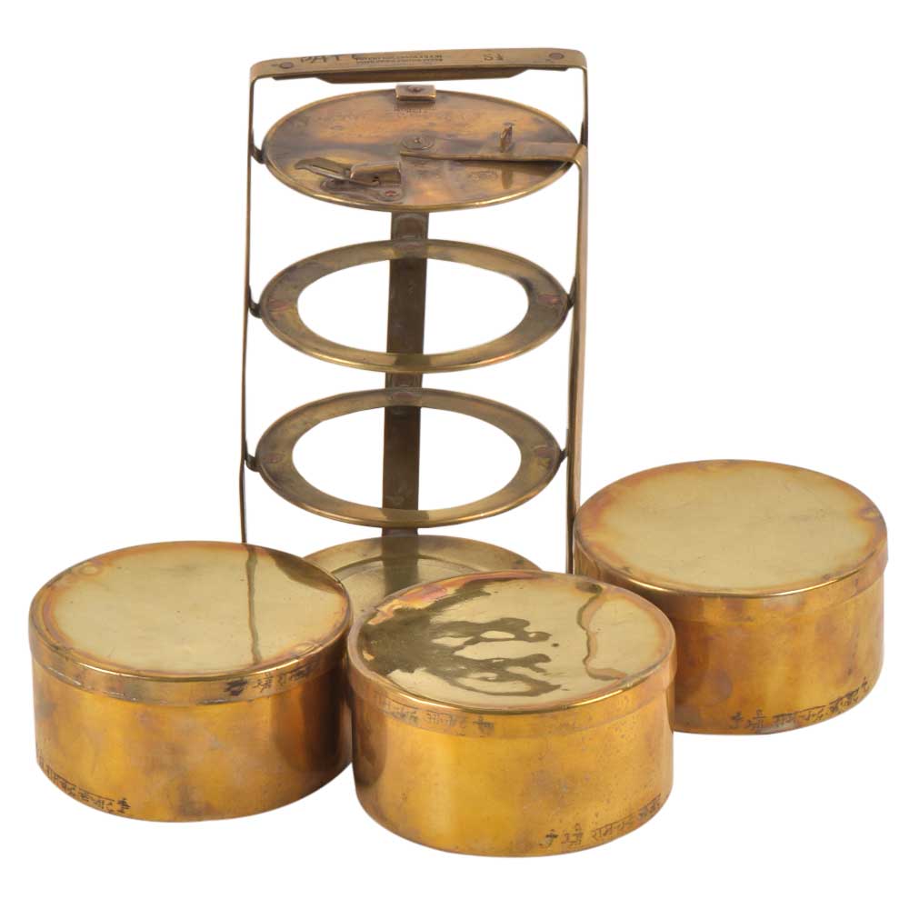 A very useful brass tiffin box made of best quality brass made by indian artisans has a simple design ans has a name inscribed on each of the box . All the boxes are stacked one above the other and secured with the help of a handle and a latch that keeps the boxes locked. A lovely gifting option for friends and family.