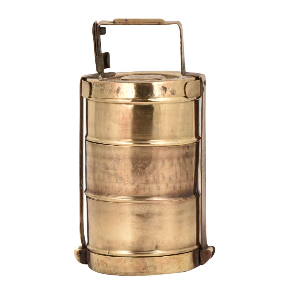 This three tier brass Tiffin box has the name of the owner engraved on the containers . The lid that is place on the top container shows the date of manufacture and other details in native language . Use it for food presentation by bloggers, showpiece, table decoration , corporate gift or personal gilt for your near and dear ones.