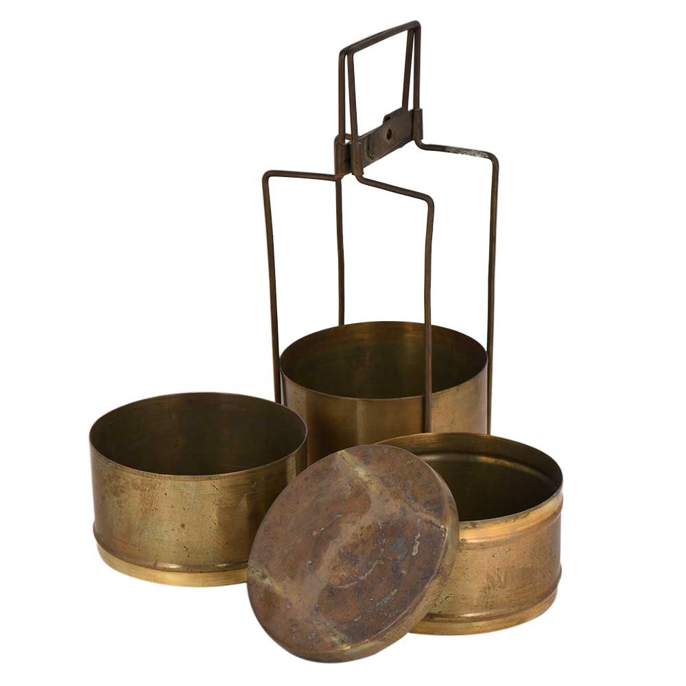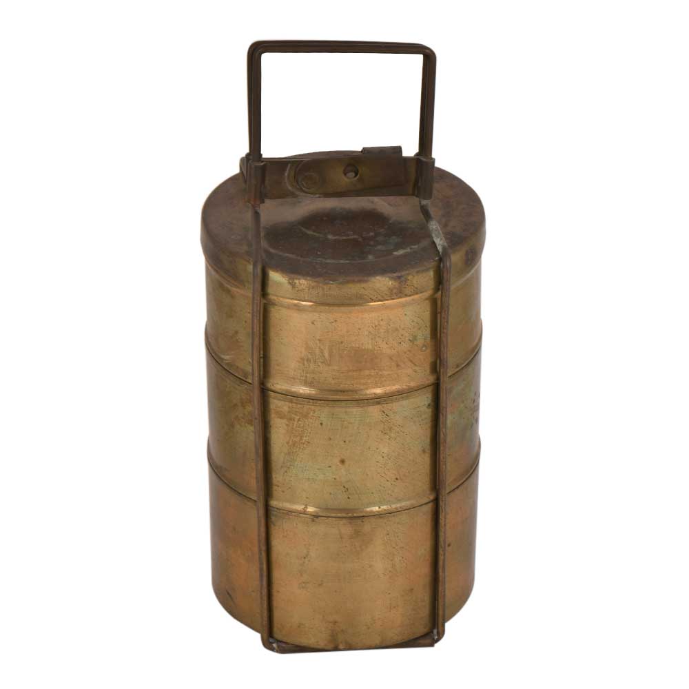 Handmade three tier brass Tiffin box with three removable container and a thin brass locking frame. Earlier it was use for transportation of food from home to office or from dhabbas to places of work. It is now used as a showpiece, for presentation of food, kitchen decoration , gift for your near and dear ones on diwali, Christmas, new year and house warming etc.