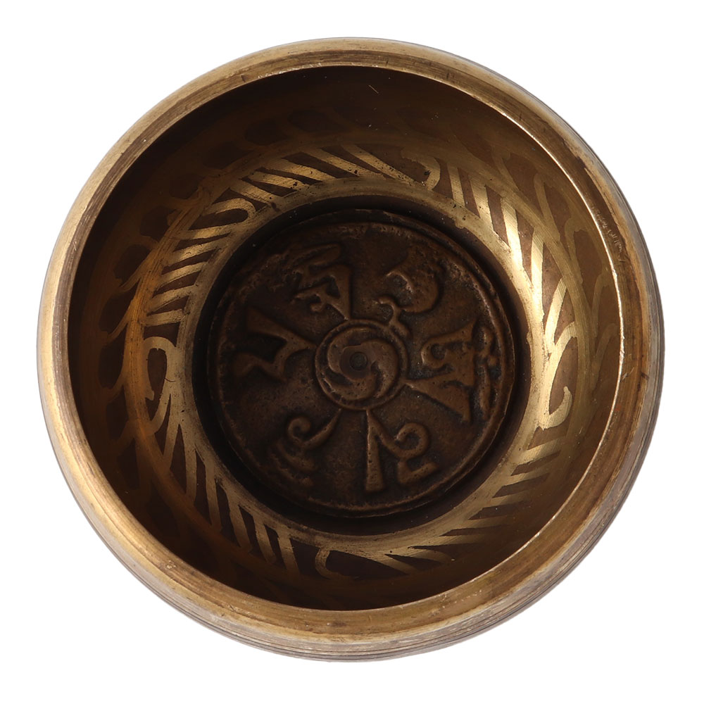 Using this copper-finished brass metal Tibetan mantra singing bowl, you may create a tranquil and healing auditory experience that will transport you into a state of peace. Our Tibetan singing bowl's deep sustained tone, which strikes the ideal mix between expert craftsmanship and exquisite aesthetic design, will provide you the mental relief you've been seeking. A singing bowl produces harmonious, calming vibrations that are beneficial for relaxation, meditation, mindfulness training, and yoga.