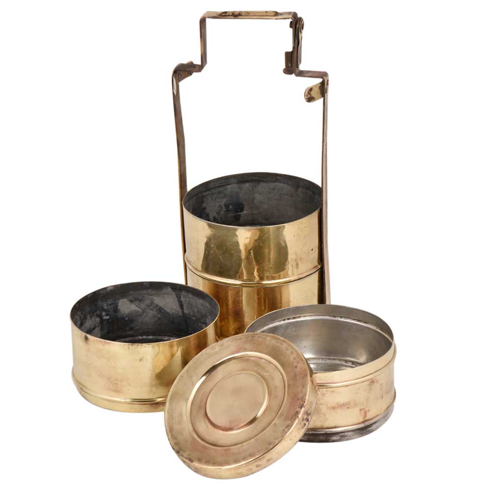 Traditional brass Tiffin box with four level or compartments that is very spacious and was known as dabbas to transport food from one place to another. It is now used for decoration kitchenware, planter pot, for jewelry storage , food presentation and gift for your near and dear ones o special occasions and functions.