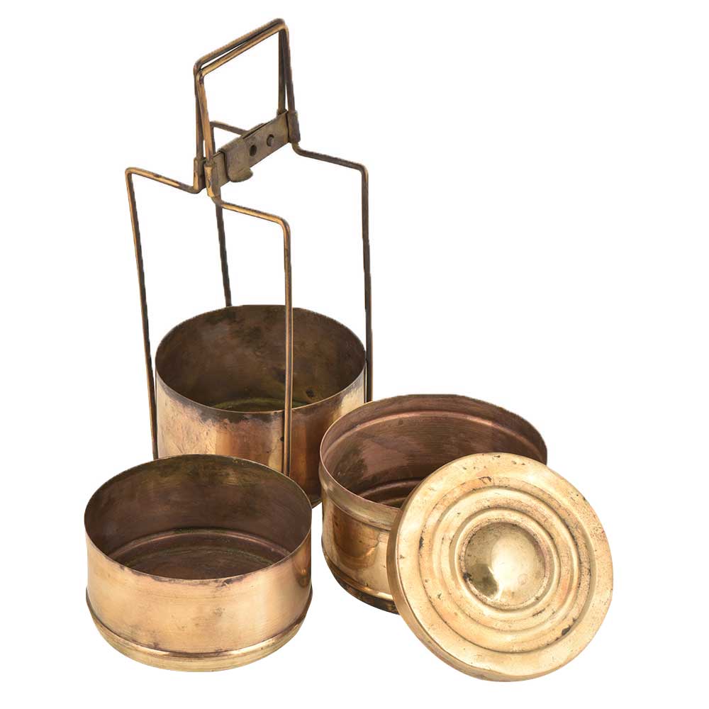 Brass Tiffin boxes with three containers is made by the expert craftsmen of India by using traditional tools .The Tiffin box has three containers placed one above the other and secured with the help thin brass strap with a single lid placed on the topmost container . Excellent gift for friends and relatives, house warming gift or kitchen display product.