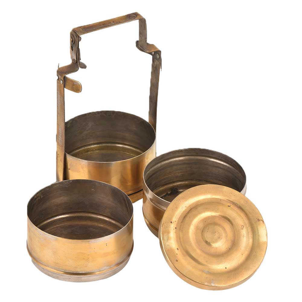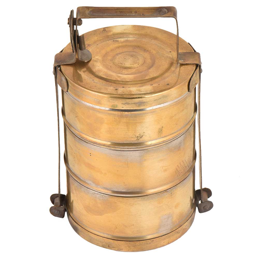 Handmade Brass Tiffin box made by the master craftsmen of India using traditional methods. It has three containers held tightly together with the help of a brass strap frame . It has a ingle lid that covers the top box when all the containers are placed one above the other. Excellent home decoration product and gift to friends and relatives.
