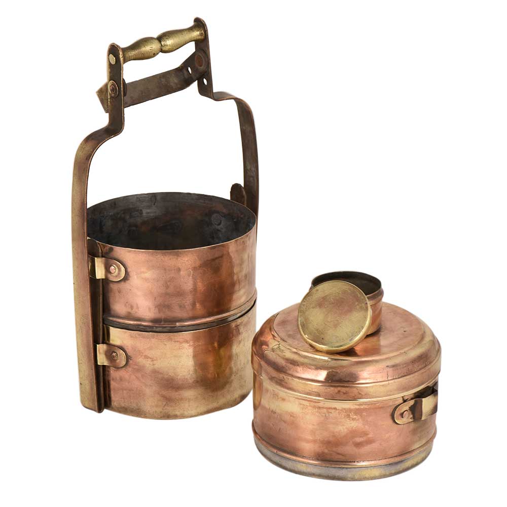 Traditional brass Tiffin box with three container and additional small container with a thick metal frame with copper polish . It was a very popular utensil in the earlier times for transportation of food fro one place to another. Use it as a planter , showpiece for flower display , keeping jewelry, corporate gift or gift for your near and dear ones on Diwali, New Year , House warming etc.