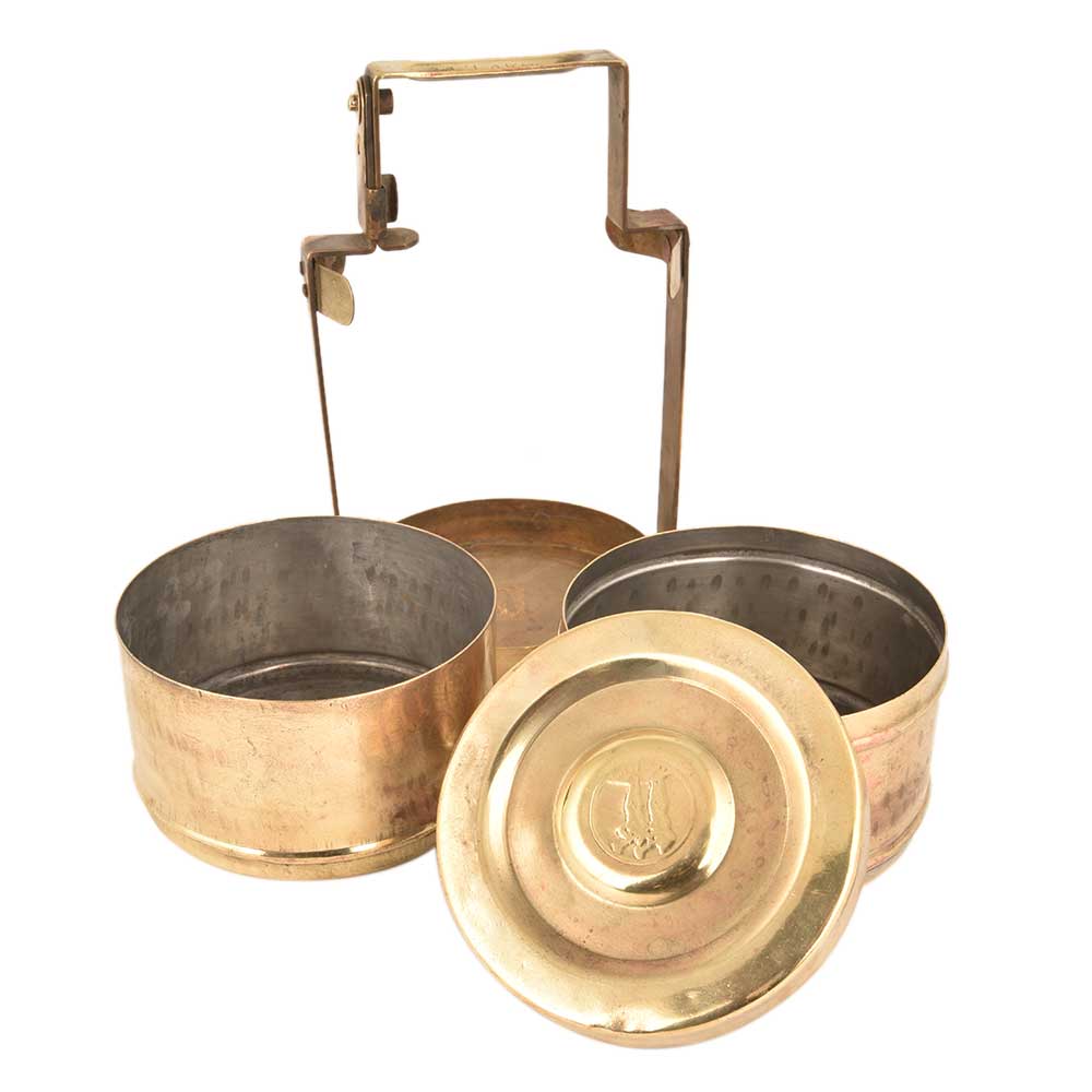Two Container Brass Tiffin Box handcrafted by the Indian craftsmen using traditional skills and methods. It has two containers with a brass frame with lekhi engraved on the top of the frame and a faint logo on the lid of the top container of the Tiffin box. Use it for presentation of flowers , as a planter, corporate gift or gift for near and dear ones.