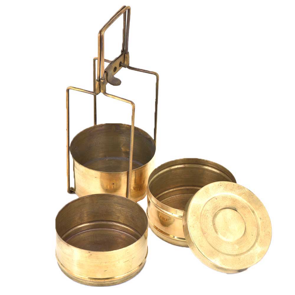 Glossy brass Tiffin box in golden color has three containers where the last container is comparatively bigger by the rest of the two boxes .it has a slight patina on the top container. The three boxes are held tightly with the help of a thin brass handle that has lock on the top .Home décor product or a great gift for your near and dear ones.