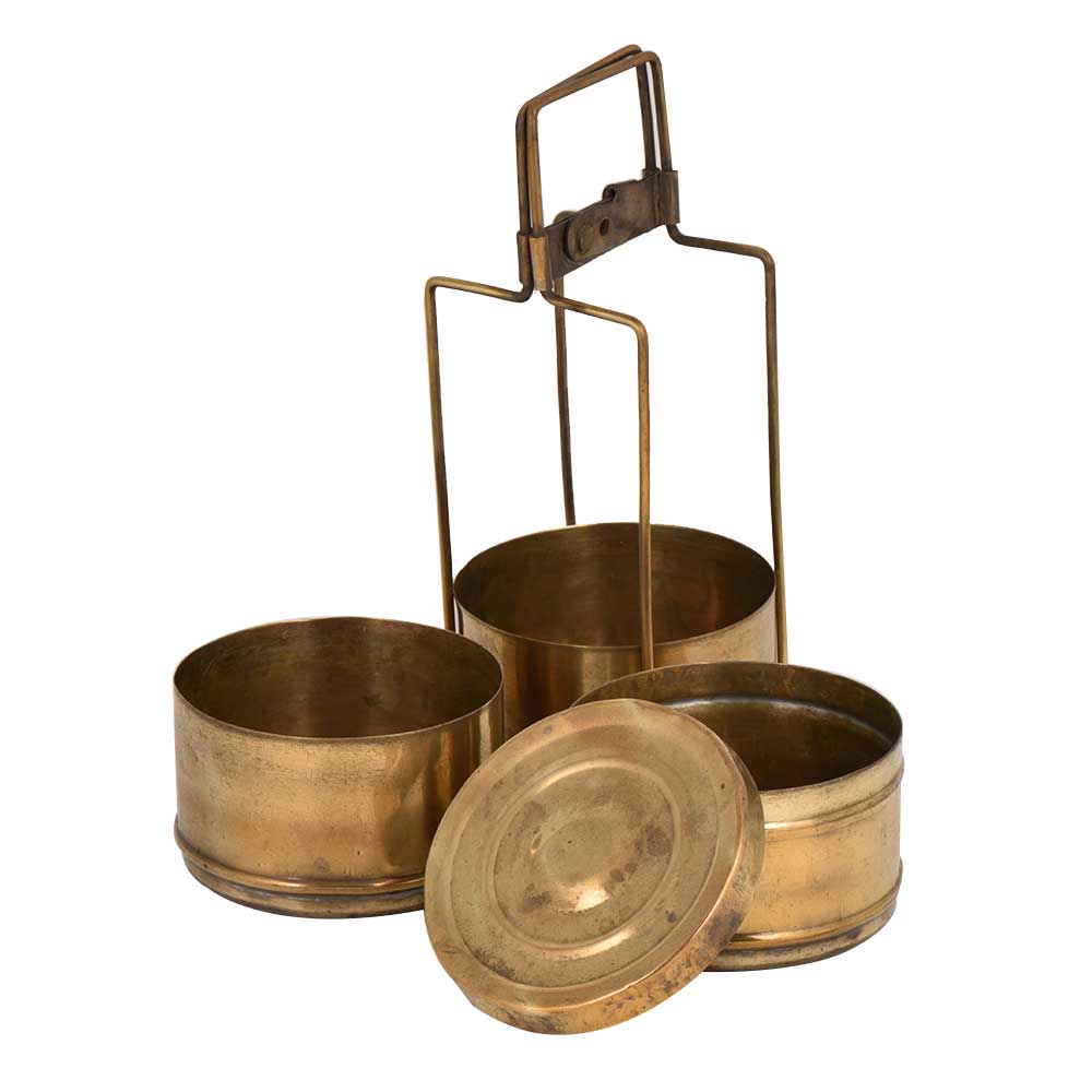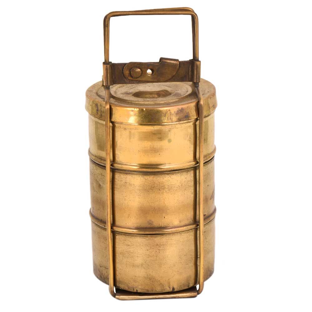 This is a Brass Tiffin Box with three storage box and a thin brass strap holds the three containers together with the help of Indian style locking style on the top of the stand . It has a singe lid that covers the top containers while the others are placed one above the other. Use it as a showpiece or gift it to your near and dear ones for Diwali, Christmas, House warming or corporate gilt.