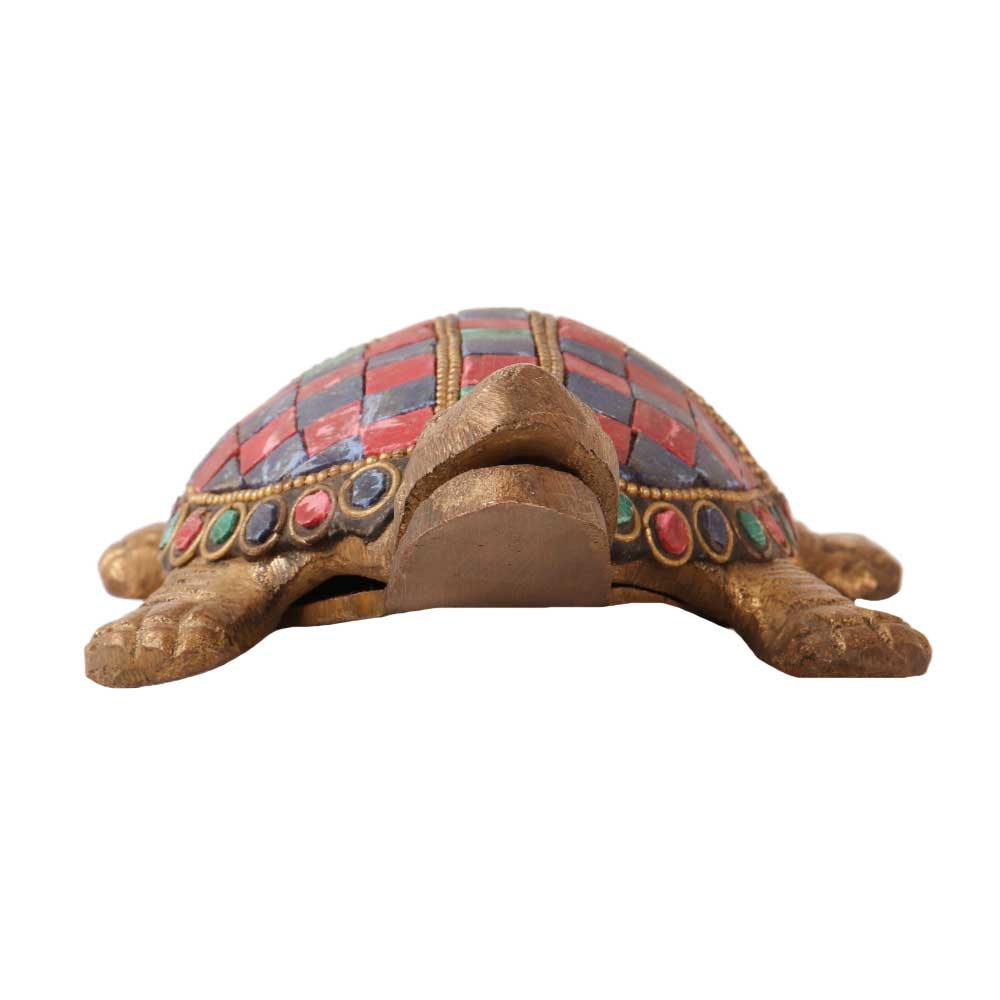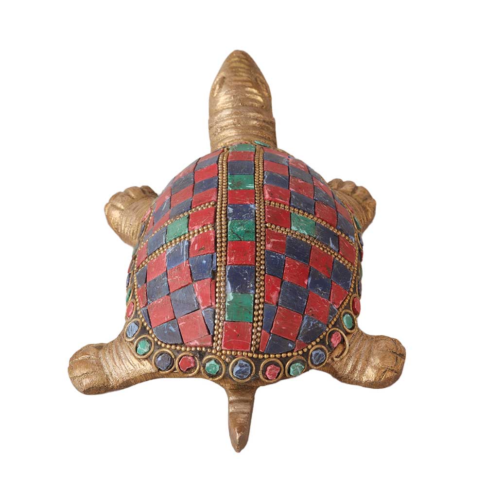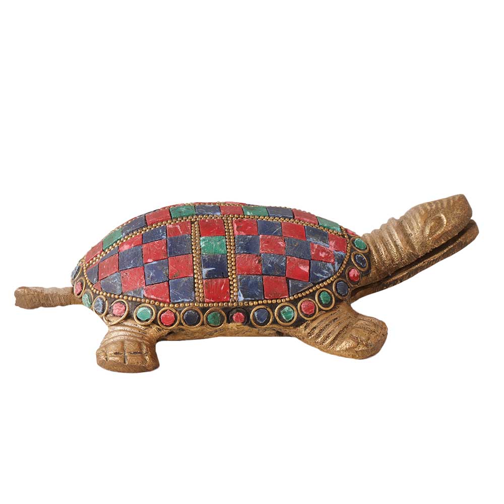 The brass tortoise with colorful stones is a unique and beautiful decorative piece that is highly valued for its symbolism and aesthetic appeal. In many cultures, the tortoise represents good luck, prosperity, and longevity, making it a popular choice for those who believe in the power of positive energy and symbolism. The statue is made of high-quality brass, and the addition of colorful stones on its shell enhances its beauty and adds a touch of elegance. Each stone is carefully placed by hand, making each piece unique. The statue is a great addition to any home or office and serves as a reminder of the importance of patience, balance, and stability. It also makes a thoughtful and meaningful gift for loved ones who appreciate unique and artistic home decor pieces.