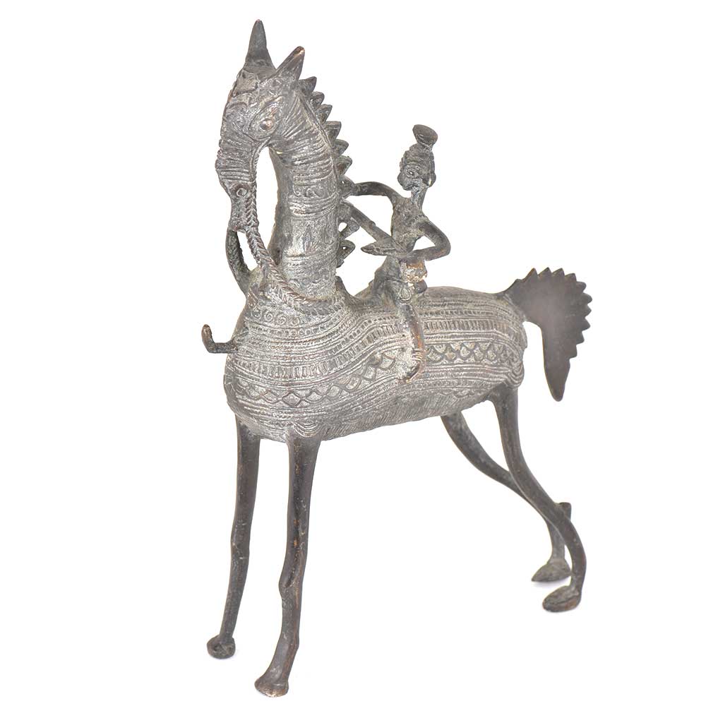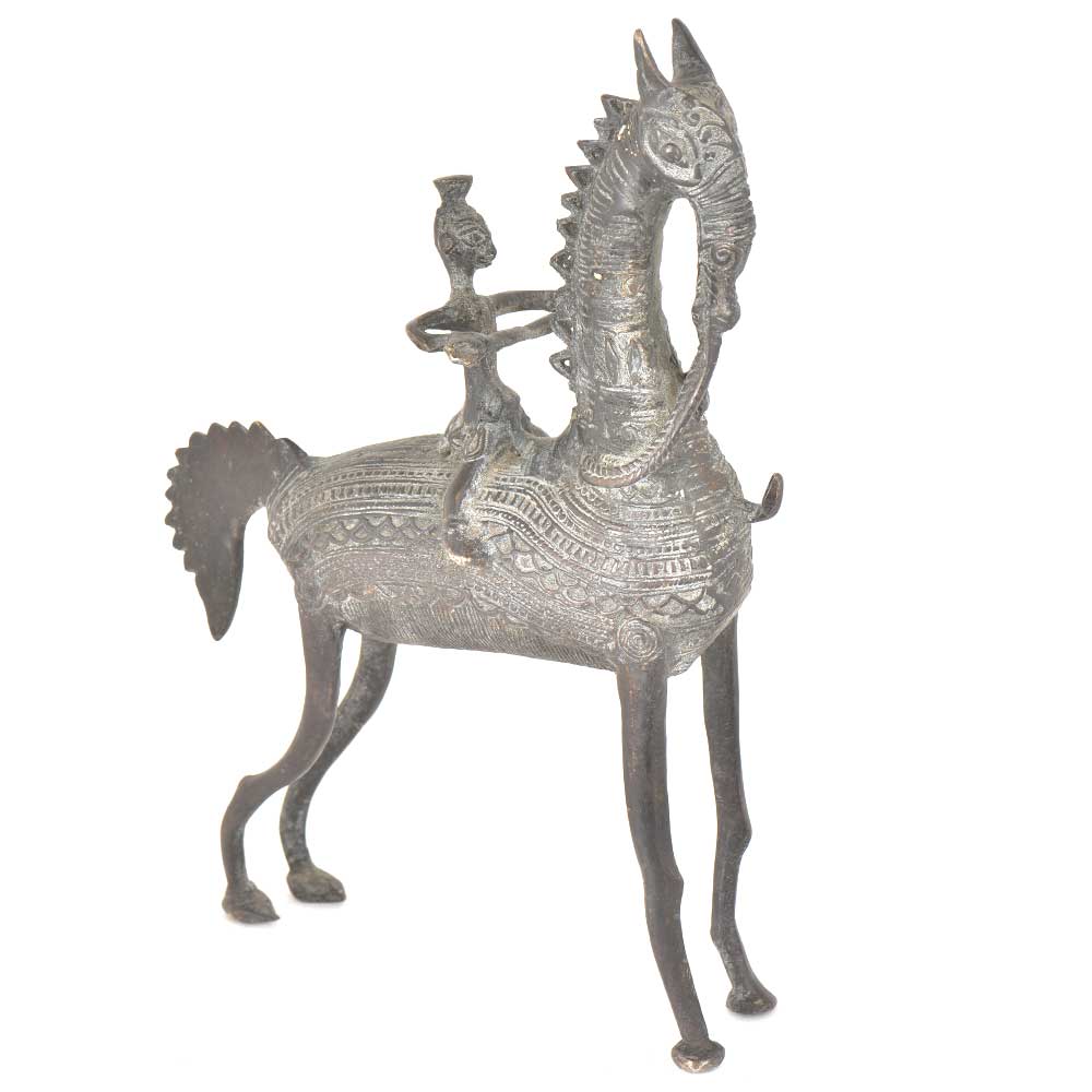 Tribal horse with a rider on is made of brass by the skilled craftsmen of India. This figurine of a horse and the rider can be used for gifting, as decorative statement piece in your vintage collection.Â