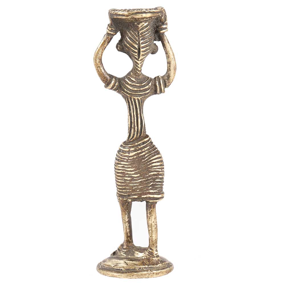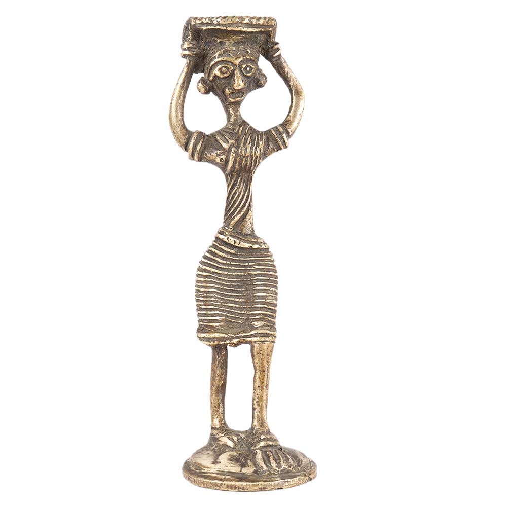 Fascinating Brass ornamental figurine of a tribal lady with a tokri on her head Improve the aesthetics of your home, office, hotel, temple, and so on. Excellent choices for marriage gifts, engagement gifts, inauguration ceremonies, holiday presents, new business, special events, Diwali and holiday gifts. A significant personal collectable.