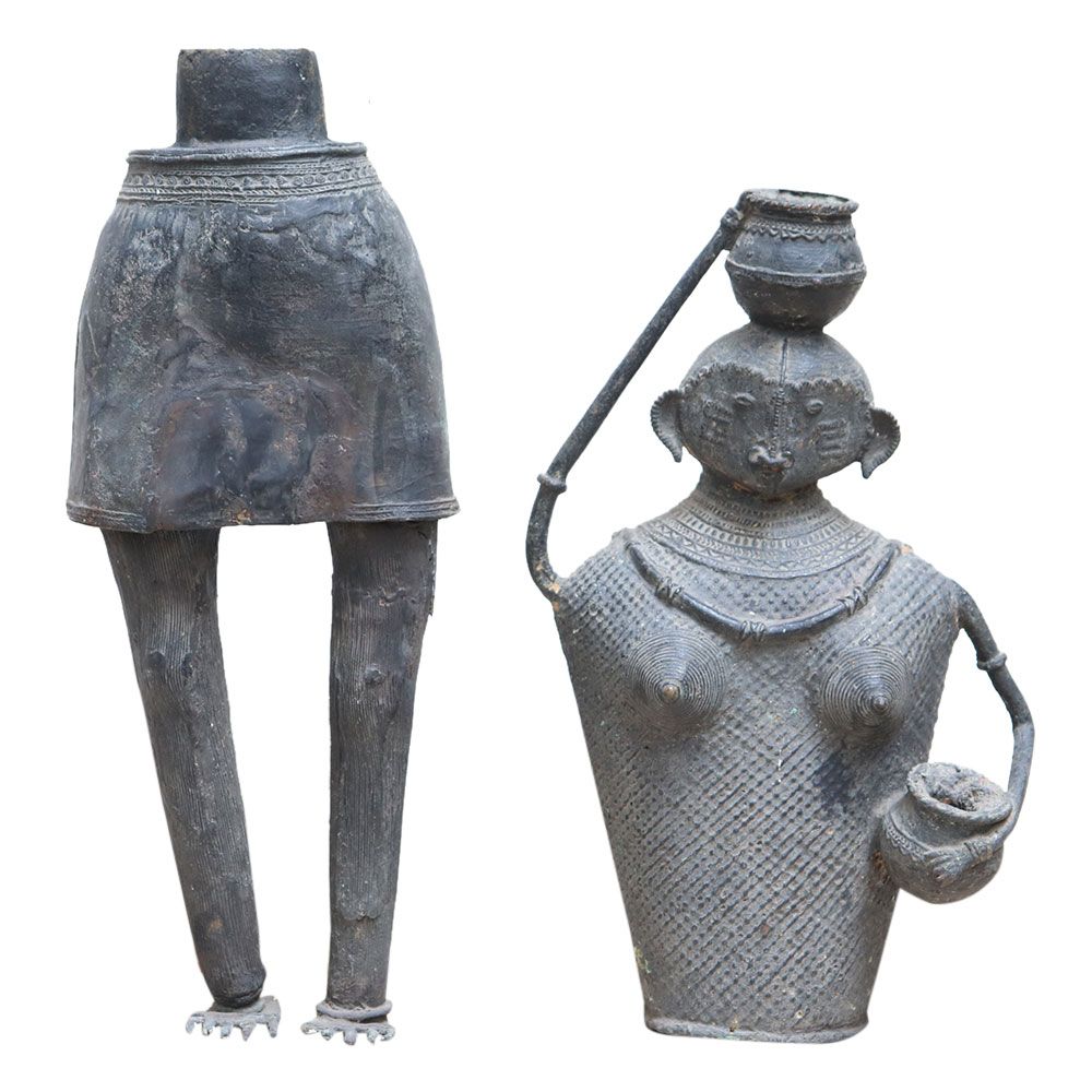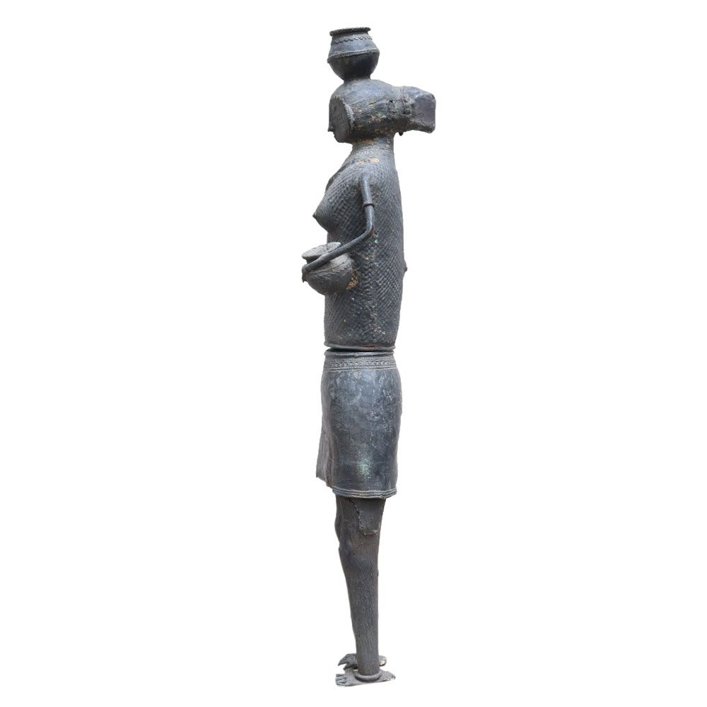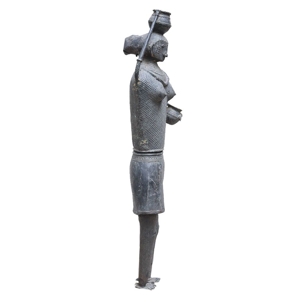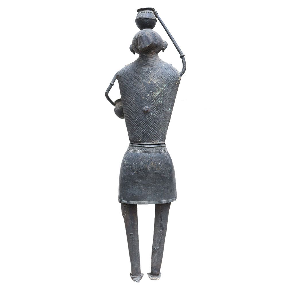 A brass statue of a pre historic Indian woman with a pot shows a native woman stands on a drum-shaped podium. She is dressed in a gochi, an adivasi wrap around her waist. Her hair is pulled back into a tight braid. Her ability to carry a pot of water on her head while wearing heavy jewellery will astound you. Lovely gifting for friends and family.