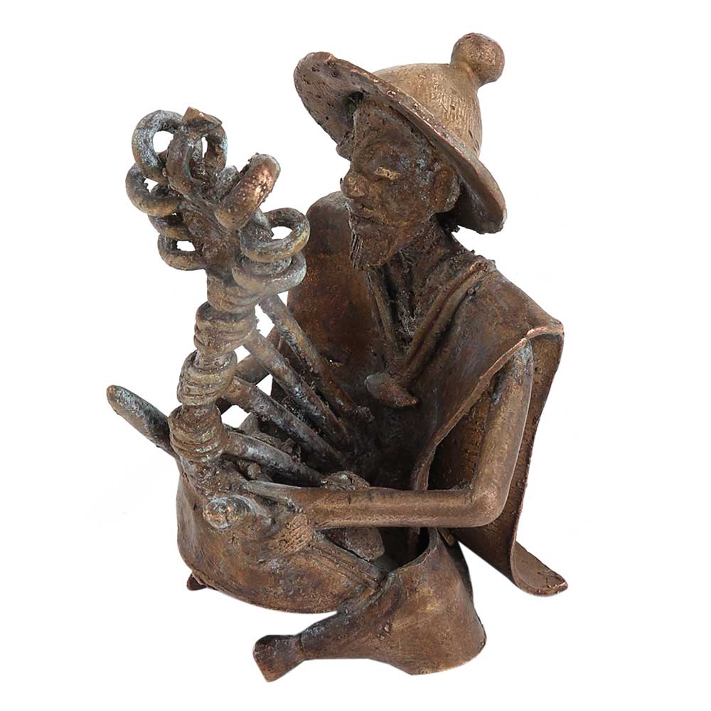 An old brass Statue of tribal African musician playing a rare musician instrument is made by local craftsmen of India. Diwali gift, new year gift, souvenir, office, school table display, house warming gift, wedding gift for friends and family.