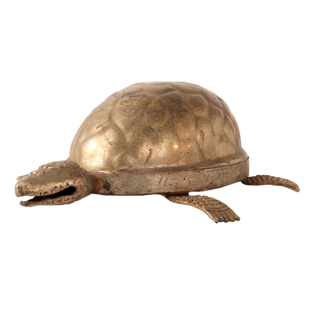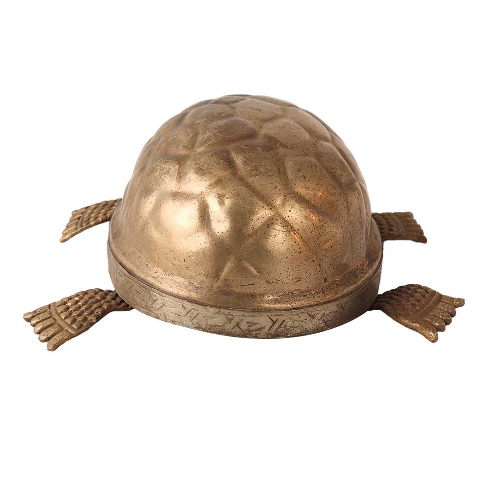 A brass statue or idol of a turtle is a common symbol in Hinduism, Buddhism, and Feng Shui. The turtle is a revered animal in many cultures and is believed to symbolize longevity, stability, and good fortune. In Feng Shui, a brass turtle statue or Yantra is often used to enhance the energy in a home or office, especially in the north or northwest direction. The brass turtle statue is typically crafted with intricate detailing, depicting the turtle with its shell, head, and limbs. Some may also have engraved mantras or symbols on the surface. The brass material is valued for its durability and aesthetic appeal, making it a popular choice for home décor and religious items. Overall, a brass turtle statue is believed to bring positive energy and good luck to the space it is placed in.