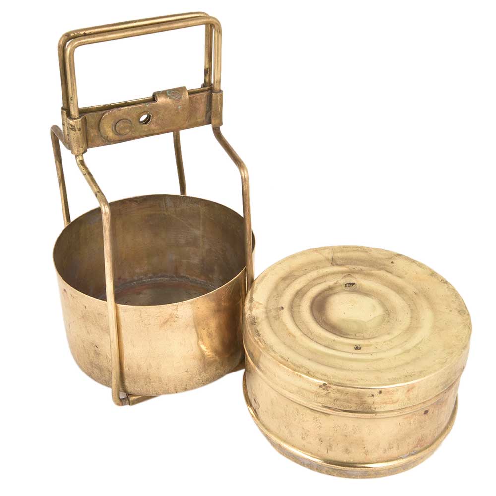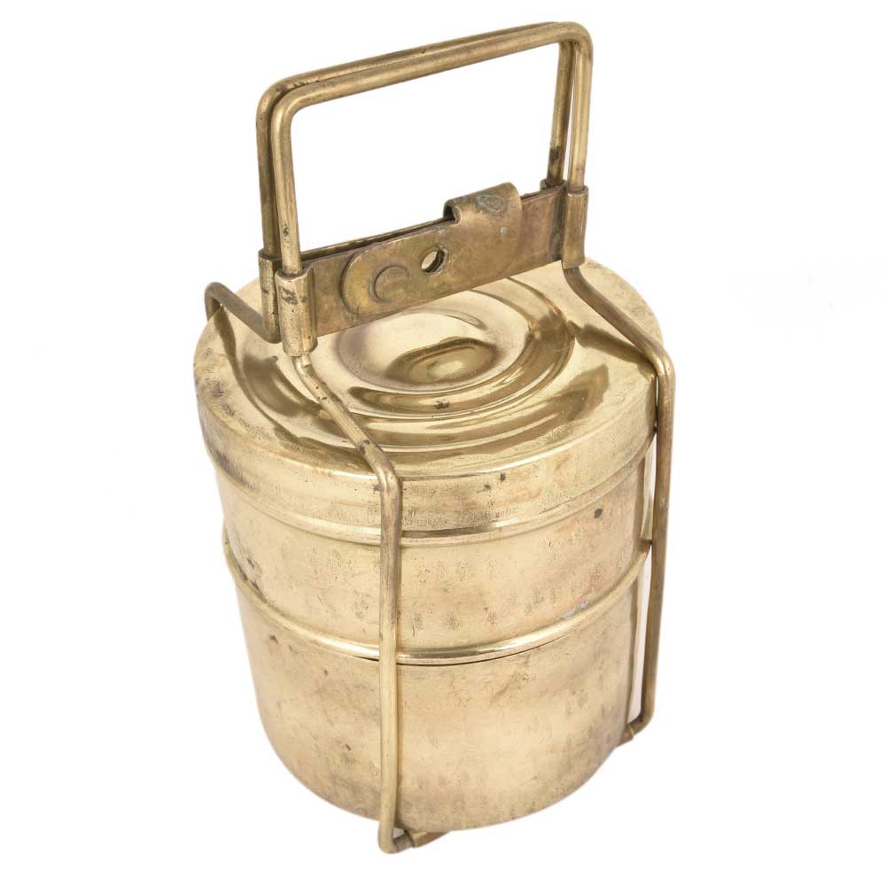 Two Tier Brass Tiffin Box With A thin Brass Strap Frame that holds the two boxes place with a lid on the top container with a traditional locking system. It can be used to store jewelry, documents, spices or as a showpiece for the kitchen shelf .Use it as a planter, for presentation of food for bloggers, corporate gift or gift for near and ear ones.