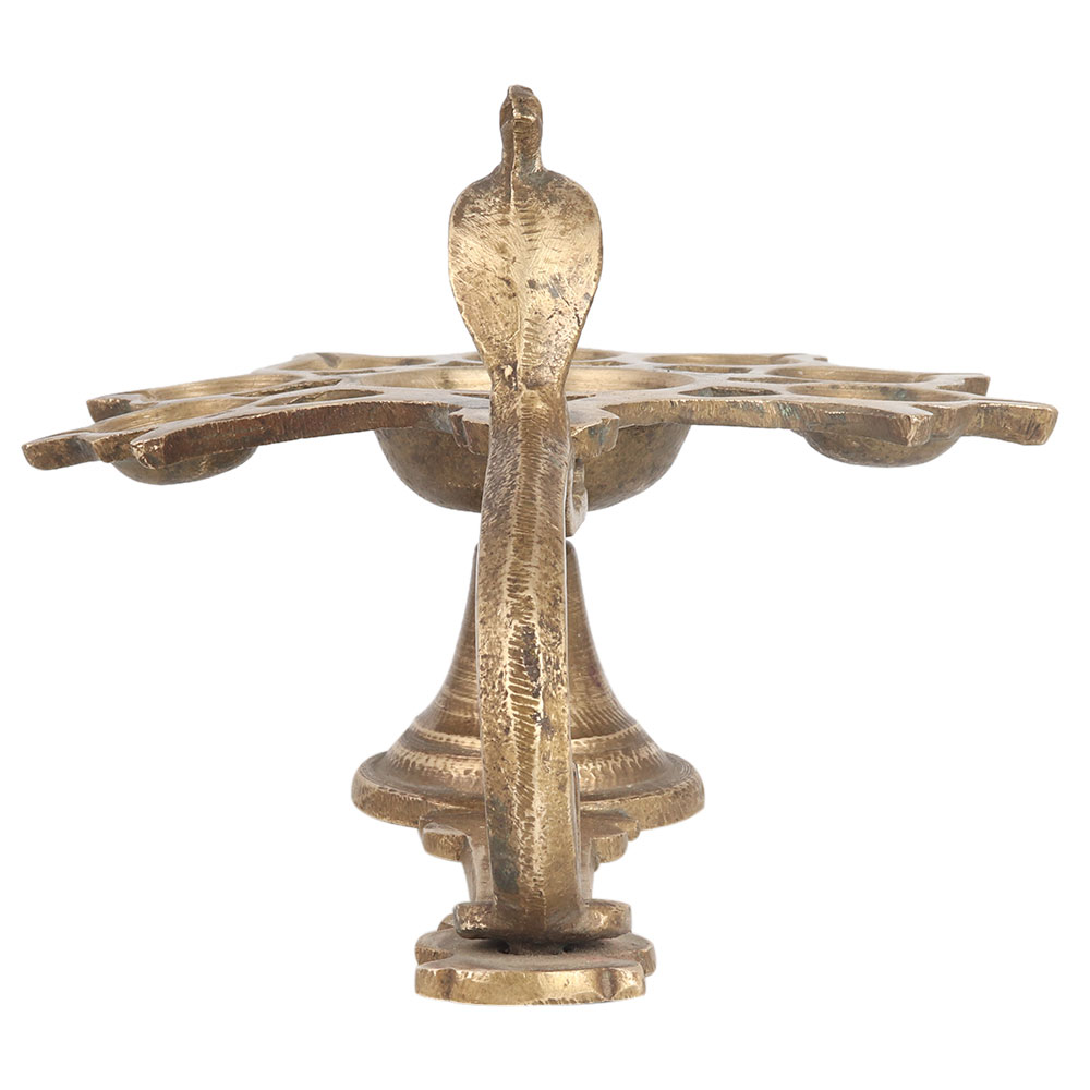 A vintage arti lamp with 8 jyots. It has been carved from brass metal alloy. It has a hancle with engraved cobra. It has a stand to hold it on the surface. In temples, priests often use this arti lamp for worshiping the god. It has 7 small jyots and 1 akhand jyot. Light the arti lamp with mustard oil or desi-ghee with a cotton wick. A perfect arti lamp for your morning and evening prayers in your temple. Its attractive design will beautify your home.