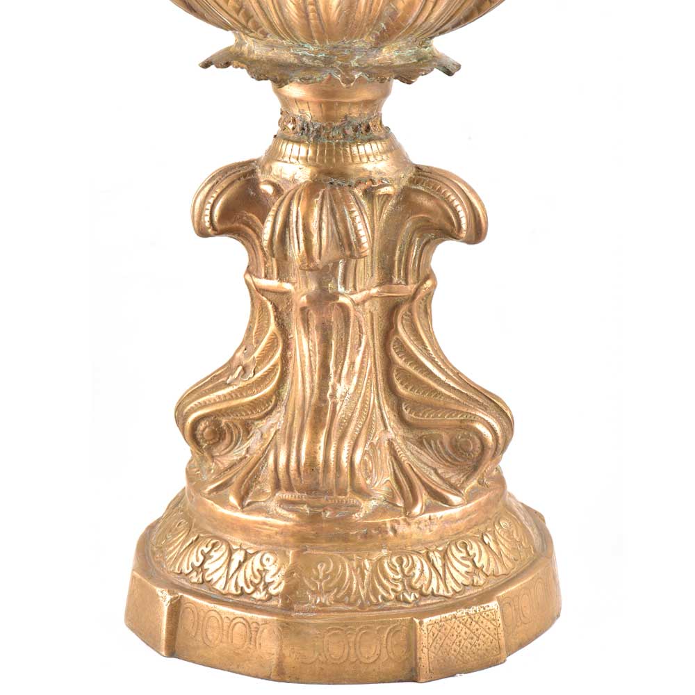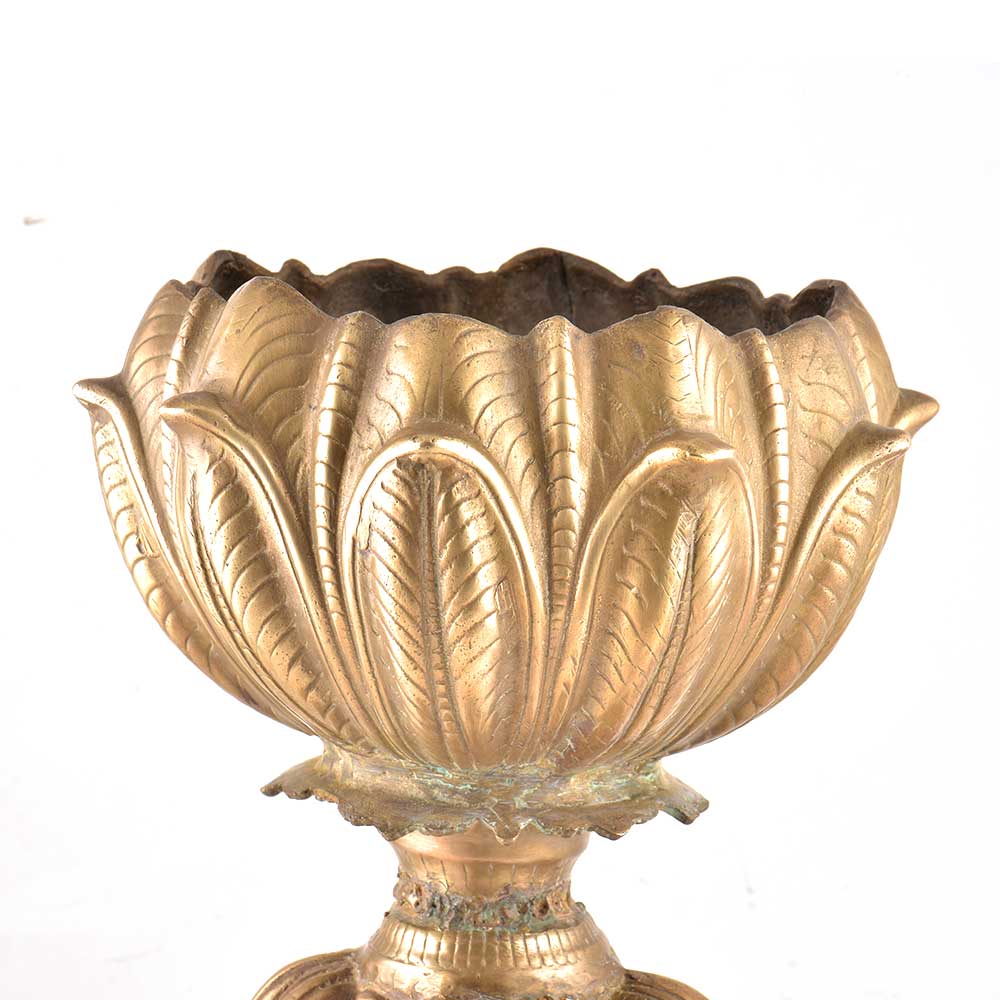 This Vintage Planter is perfect for ferns or flowers. It strikes a perfect balance between style and utility. Beautifully designed, this engraved brass planter is perfect for outdoor spaces. The pot is in the shape of a flower with lovely ornate design on the stand or pedestal.