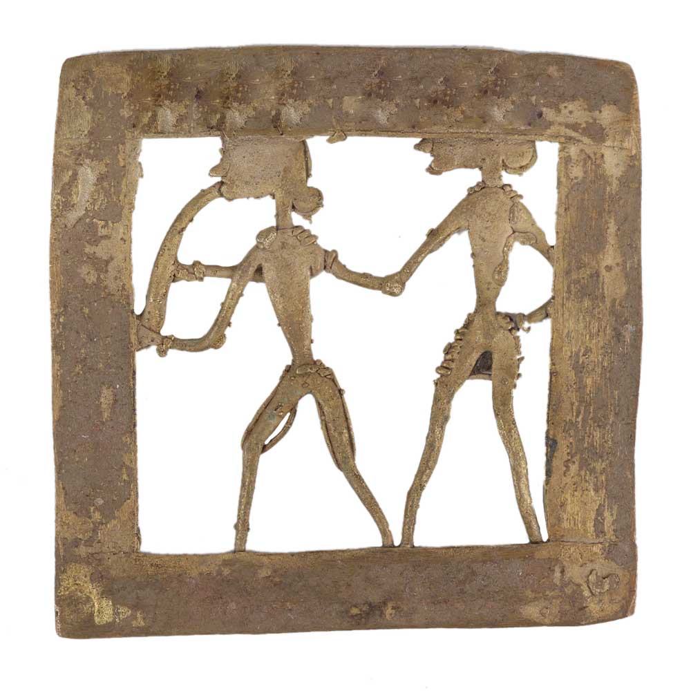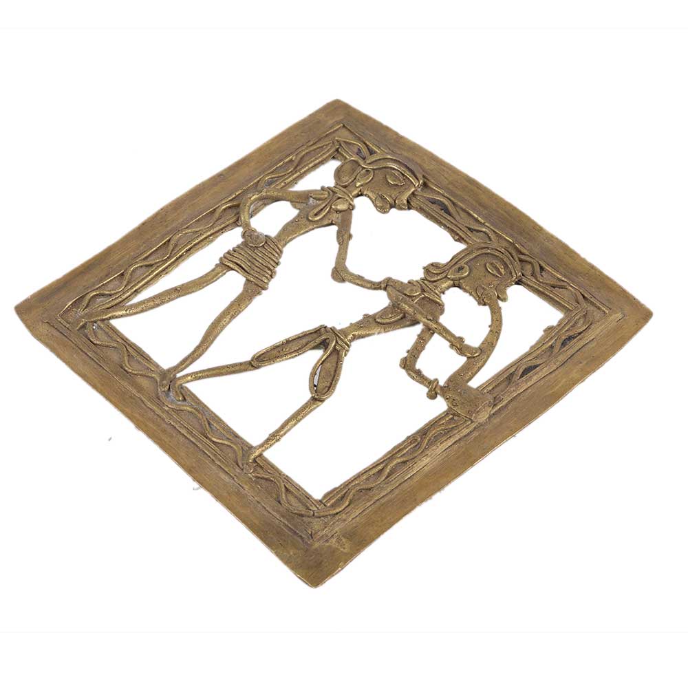 Brass dhokra wall art hanging shows a happy couple where the musician trumpet with lady in brass metal frame. This art shows the brass figurines made in wired form and has a lovely engraved border to add a finishing touch to the hanging. Home decoration, office, restaurants, hotel decoration, showpiece or souvenir.
