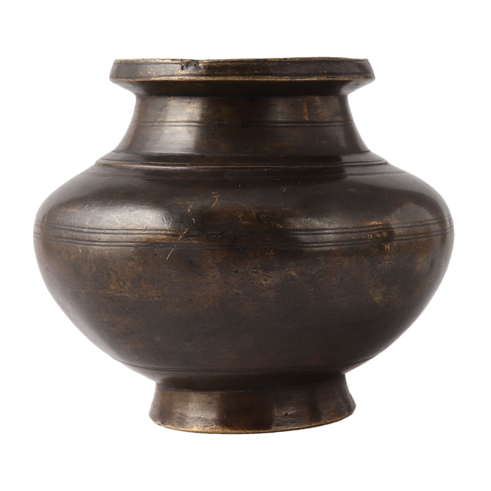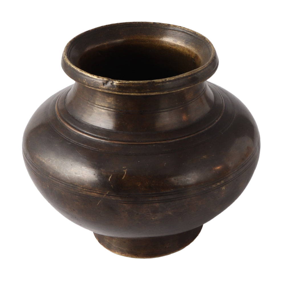 The antique brass Indian pot has religious significance and is a rare collectible. If you're an antiques enthusiast, you may even use it as a planter in your home. It is exquisitely carved. Craftsmanship on handmade items manufactured by artisans is difficult to imitate. Originally, this lovely antique brass jar was used to hold drinking water. Beautifully shaped and expertly carved with floral patterns by hand. A beautiful patina and good condition.