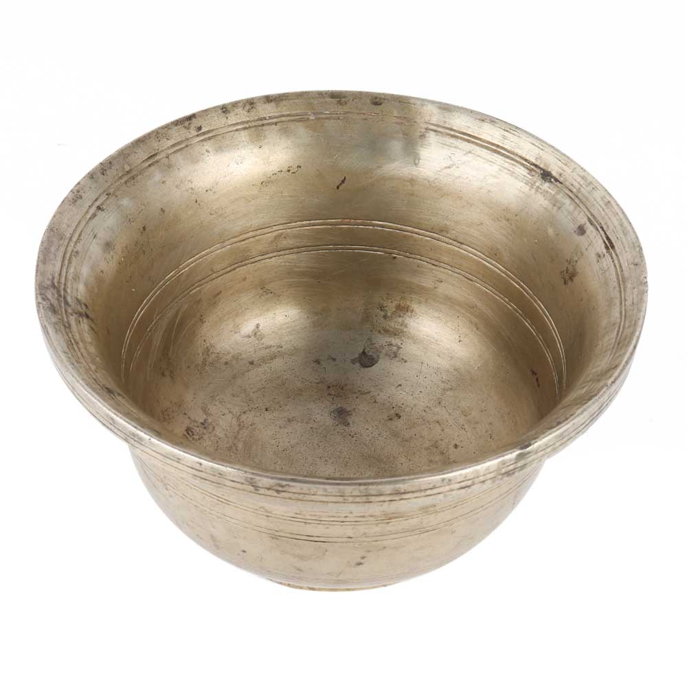 This silver brass Tibetan Buddhist water offering bowl can be used for Yoga, Meditation, and as an offering bowl for Tibetan Buddhists. It can also be used to serve food and water in the home or temple, as well as a decorative item.