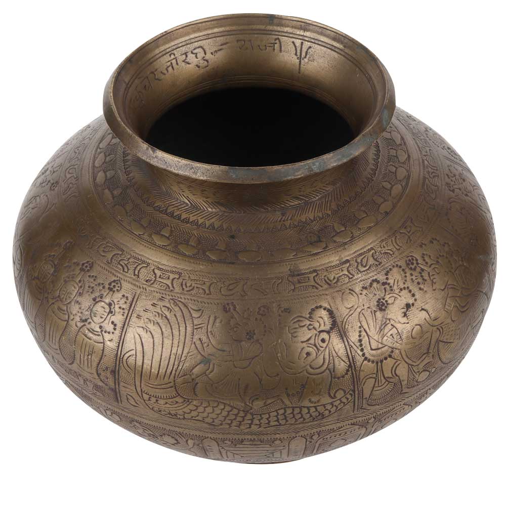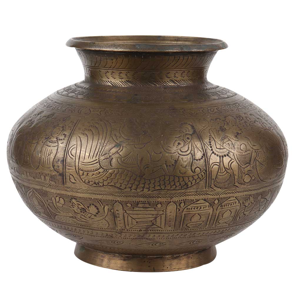 A highly engraved brass water pot with big leaves and vines that has a traditional round shape with a wide mouth an a broad body . Use it as a flower vase , in wedding decoration, reception area of hotels and bars . Great gifting option or an excellent return gift .