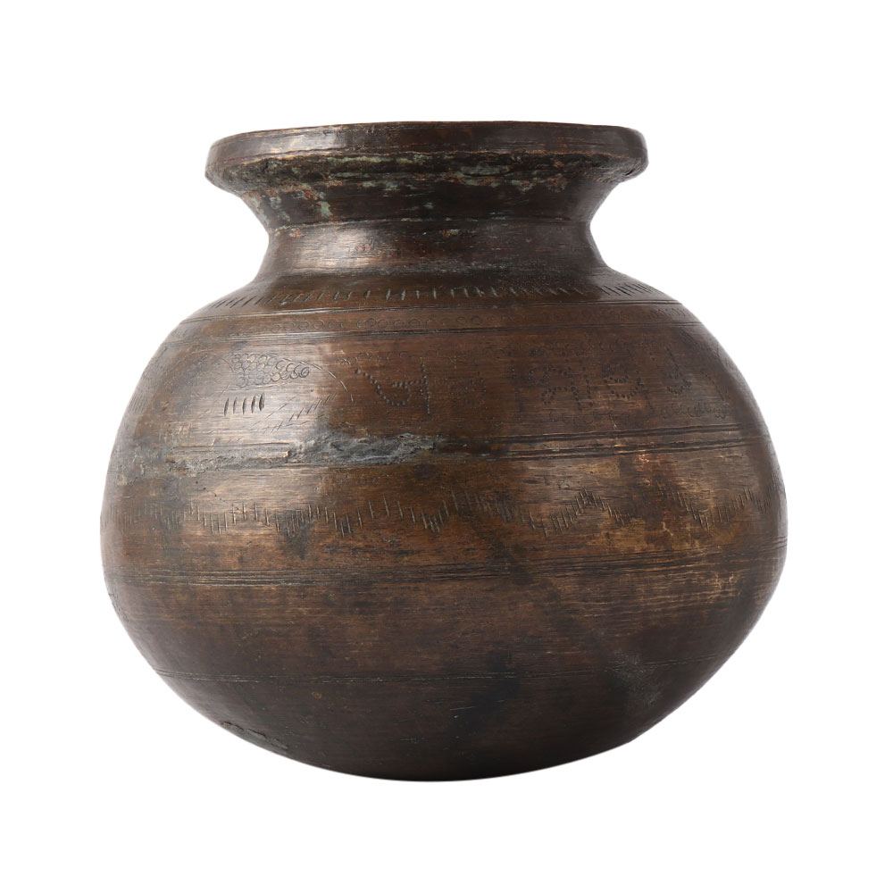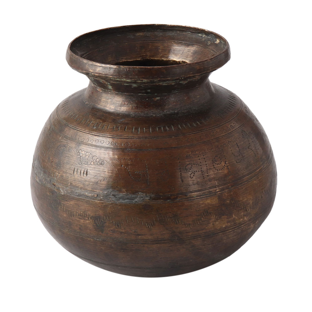 This exquisite Indian puja pot made of antique brass is up for your consideration. Its original purpose was to carry holy water, but you could also use it as a jardiniere or just as a standalone ornament and it would look lovely anywhere in your house. The lions, rosettes, and jungle plants that are engraved on it are done by hand very skillfully. Along with some age blemishes on the outside, there is a lot of verdigris inside. This old brass lota transports the wearer back in time to a time of regal customs, exquisite cultures, and a rich way of life. When combined with other artifacts, this lota in its classic lota form becomes a charming antique possession.