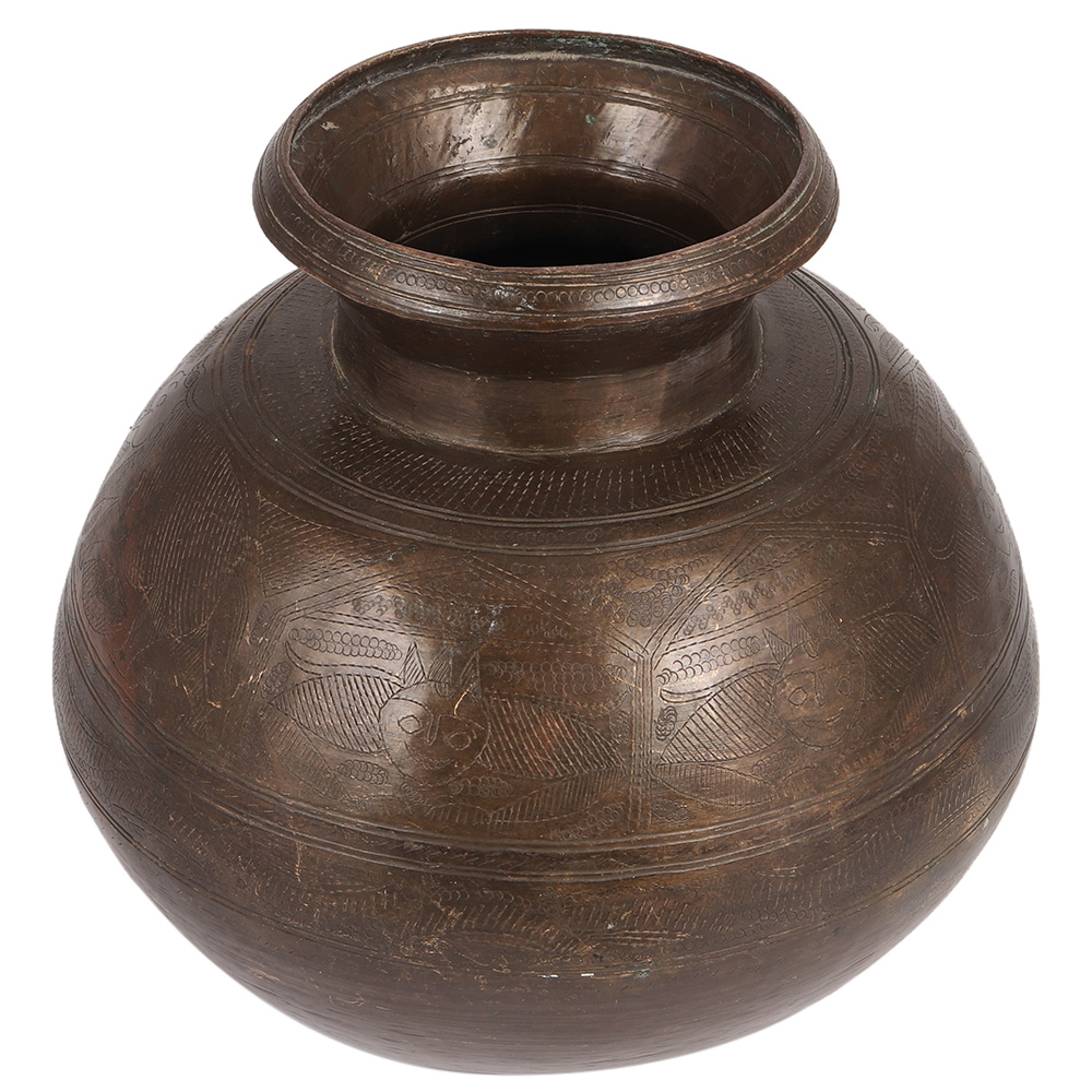 A really lovely unique brass water pot with birds and leaves etched all over the pot's surface. It also has various designer elements engraved on it, such as a diamond and a circle. There are also extra circular borders with varied designs to complete the theme. It is used to keep holy water in temples and other places of worship. The weight is substantial. It can also be used as a vase. It also works well as a decoration.