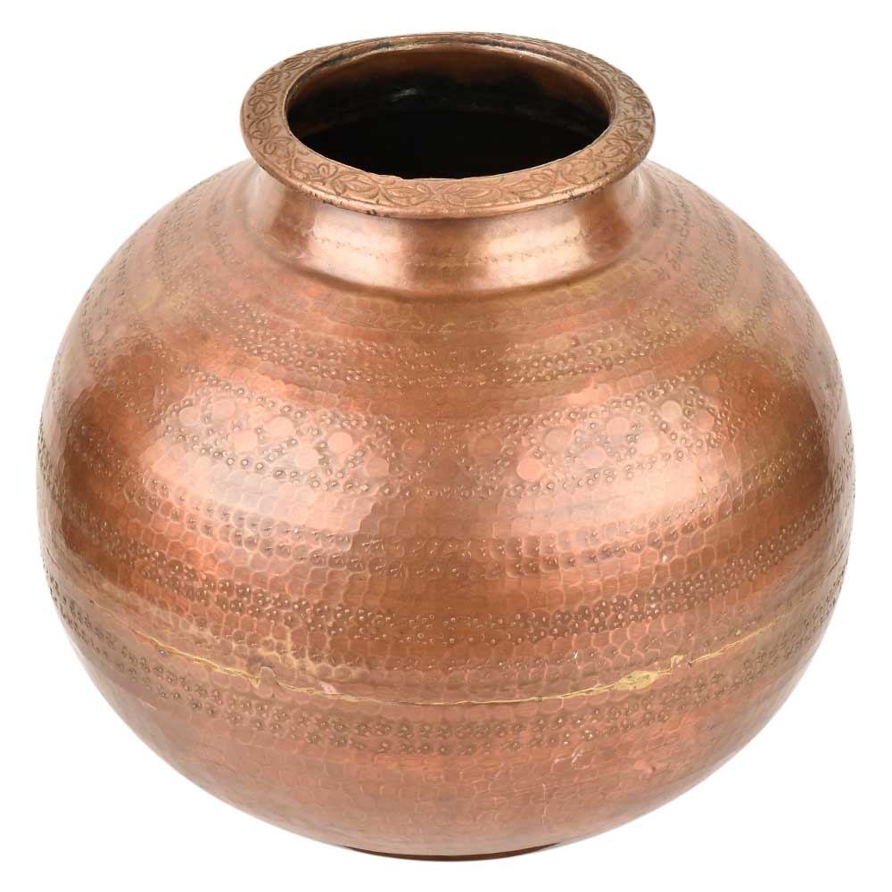 This hand crafted brass water pot is made by expert artisans of India . This brass pot has a bulbous body was filled with holy water as a nice patina was used in temples and other religious places . It has a bottom rim for support an has a large belly to store water and small mouth .It comes with a nice copper finish.