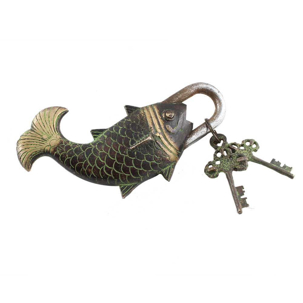 Brass Whale Fish Padlock Lock with Skeleton Key In Pair Patina Finish adds an antique look to your home, office, school ,hotels, gym, clubs, restaurant doors. Wedding gift, birthday gift and souvenir.