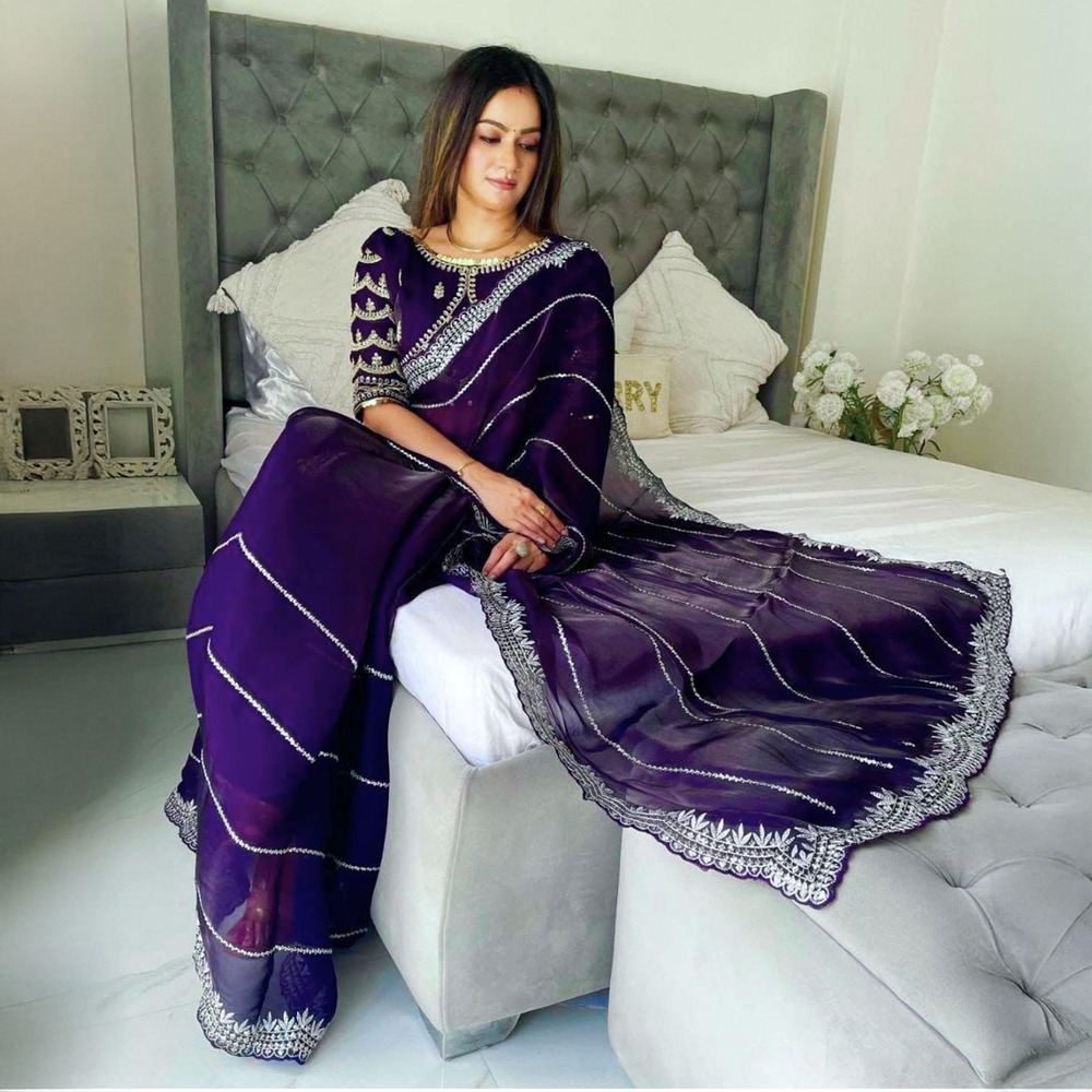 Drape yourself in regal luxury with this exquisite Bridal Bollywood-style saree crafted from premium pure organza silk. The rich royal purple base exudes sophistication and charm, while delicate silver thread embroidery runs in elegant diagonal lines across the body, creating a graceful shimmer with every movement. The scalloped silver zari border is intricately detailed, making it the perfect pick for modern brides, wedding guests, or glamorous evening events. The sheer, lightweight texture of organza silk offers a flowy yet structured drape that flatters all silhouettes. Paired with an embellished blouse and statement jewelry, this saree transforms any occasion into a red-carpet moment. It blends traditional bridal aesthetics with contemporary Bollywood glamour in the most effortless way.