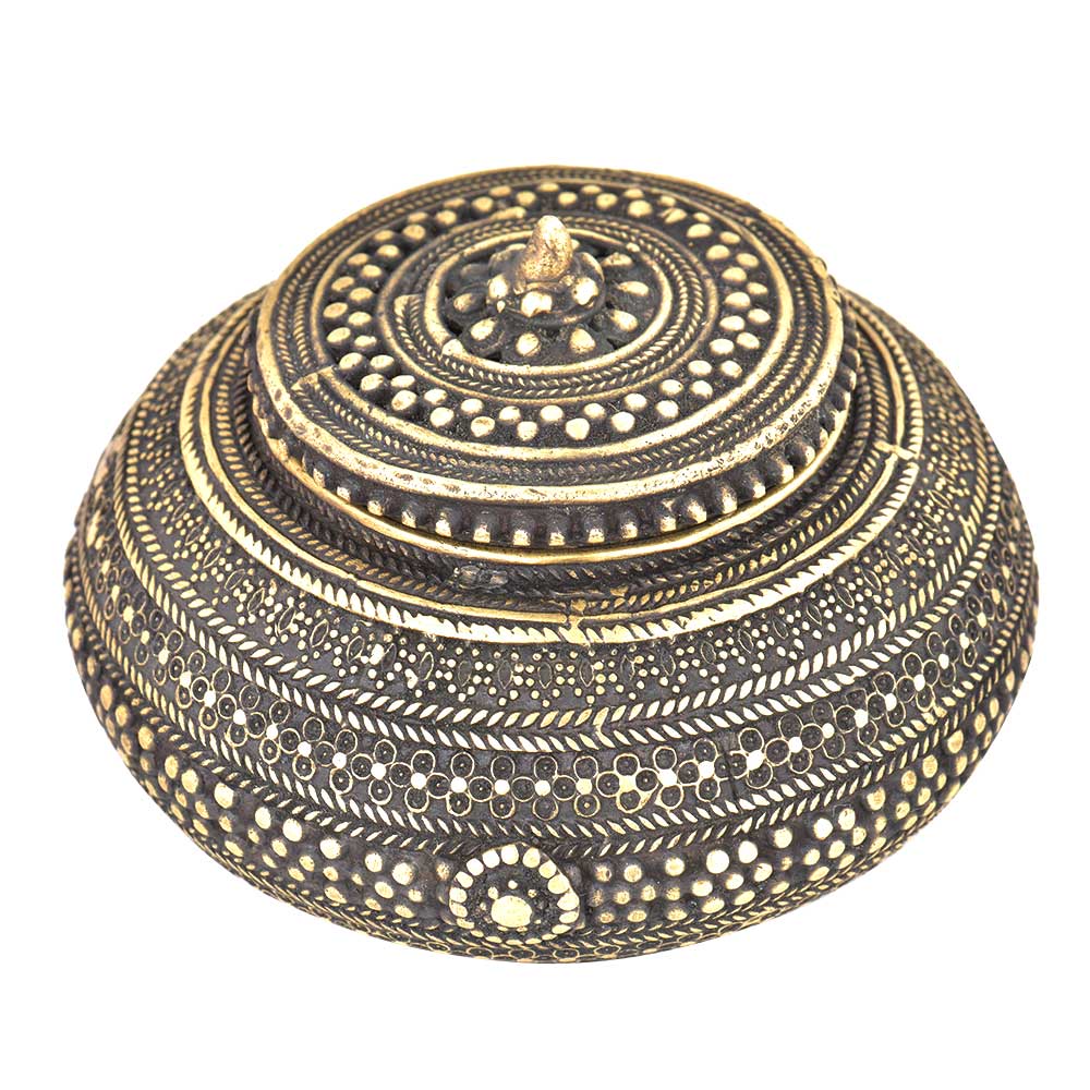 Jewellery box with lid and fine engravings which makes this box more attracting and beautiful. This beautiful jewellery box is circular in shape and is made of bronze and is handmade by the skilled craftsmen of India. It can be used for gifting and decoration etc..