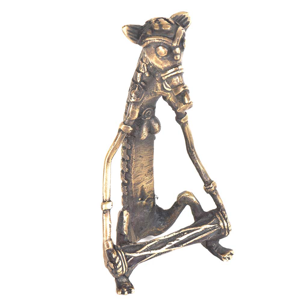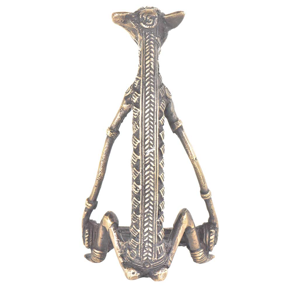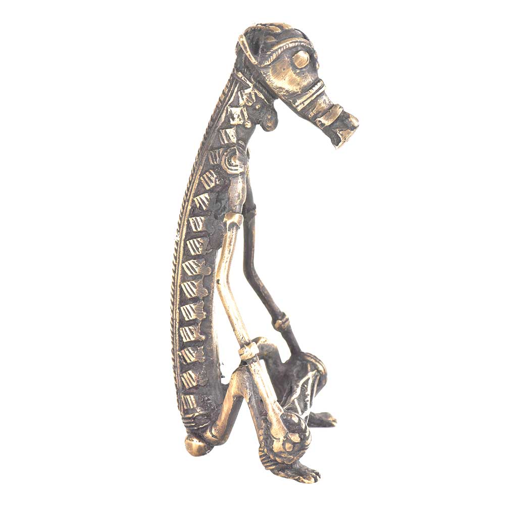 Hand crafted beastly musicians made of brass and playing tribal instruments called drum thus recreating a real life village ceremonial scene which is still witnessed today in India. These brass castings are made from the 4 000 year old casting technique founded in Dhokra, India. Thus the term the ''craft of Dhokra'' which refers to a lost wax and clay model casting technique for making brass and bronze artefacts. This skilled technique was later taught and spread throughout Eastern India to such places as Bastar, Andhra and Orissa - from where this half human with animal head musician most likely originate from.