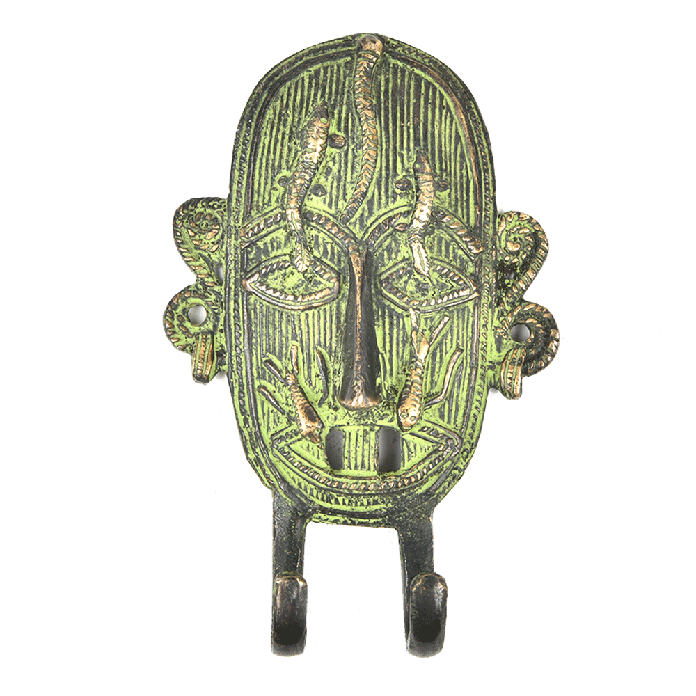 Bronze Patina Tribal Face Mask with Fishes Wall Hooks. When Put on Wall or Cabinet It is An Art in Itself. Its A Mix of French and English Design. Suitable for Your Kitchen, Cupboard, Rooms, Cabinets, Almirahs, Bathrooms, Doors, Etc.