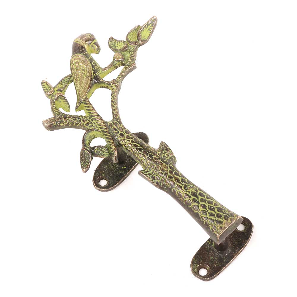 Hand Casted in Solid Brass, this Pair of Vintage Green Brass Parrot on Tree Door Handles are Simply Gorgeous Made by Indian Artisans from West Bengal, these Door Handles will Adorn Any Door and is a Conversation Starter. Ideal for Drawer, Dresser, Cabinet, Wardrobe, Cupboard and Almirah.