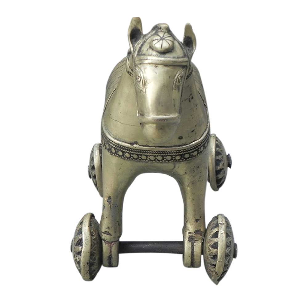 Bronze Horse on Wheel. Handmade by Lost Wax Process by Skilled Craftsmen. Its Putina has Been Rubbed Off to Give It a Subtle Golden Lusture.