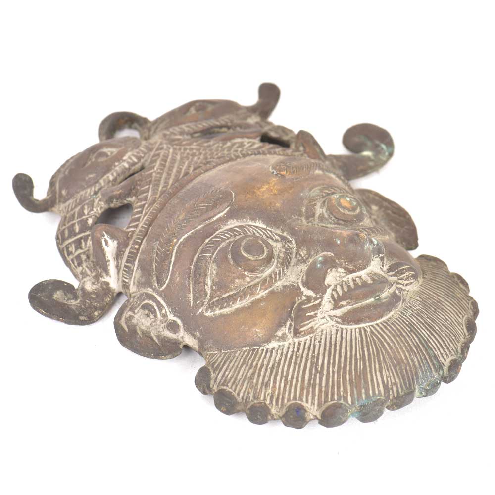 Handmade man face mask wall hanging is made of bronze by the skilled craftsmen of India. This wall art face mask of a man has bulging eyes and a moustache and beard.