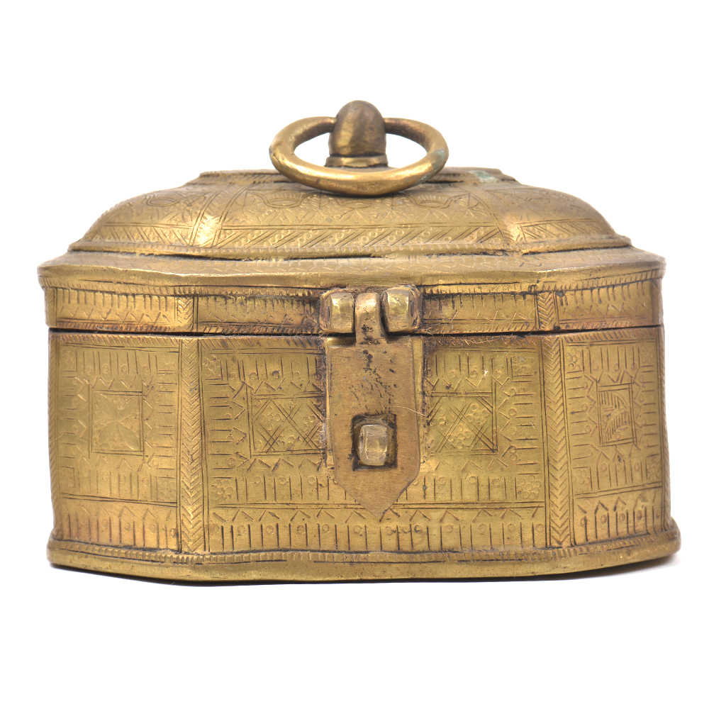 This Octagonal Shaped Jewellery Box is Made of Bronze and It is Handmade by the Skilled Artisans of India. This Jewellery Box is Engraved Beautifully and It can be Use for Decoration, Personal Use or Gifting.