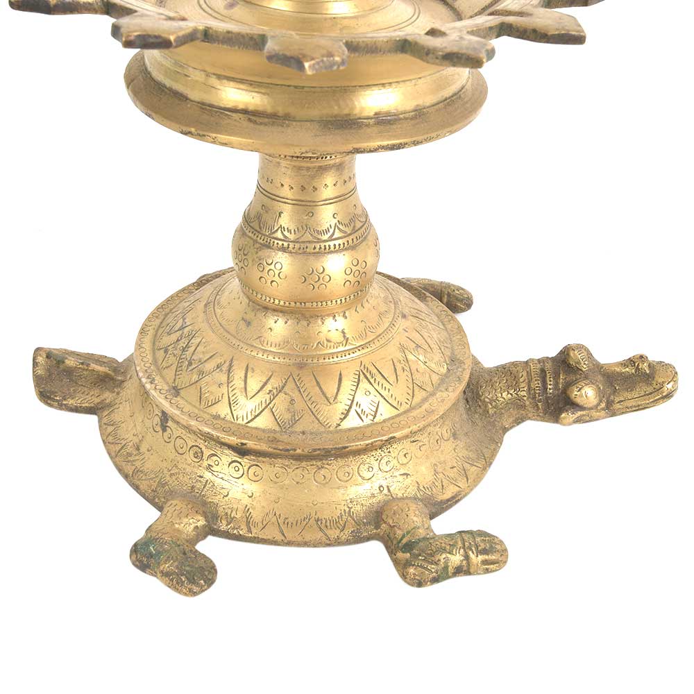 The South Indian Oil Lamp is Handmade by the Skilled Craftsmen of India. This Oil Lamp is Made of Bronze. This Oil Lamp has a Beautiful Peacock on Top of the Oil Lamp and a Turtle Beautifully Made At the Base. The Oil Lamp has 5 Layering. Mustard Oil, Ghee and Different Types of Oil can be Use to Enlighten This Lamp.