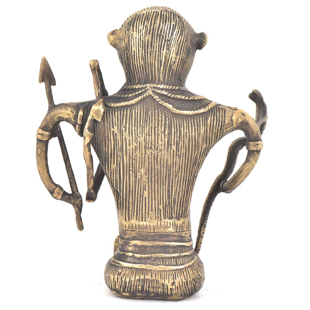 Tribal art huntsman sitting holding a snake in his hand is and carrying bow & arrow on his shoulder. This beautiful bronze statement piece is handmade by the local craftsmen of India. It can be used for gifting and home decoration.