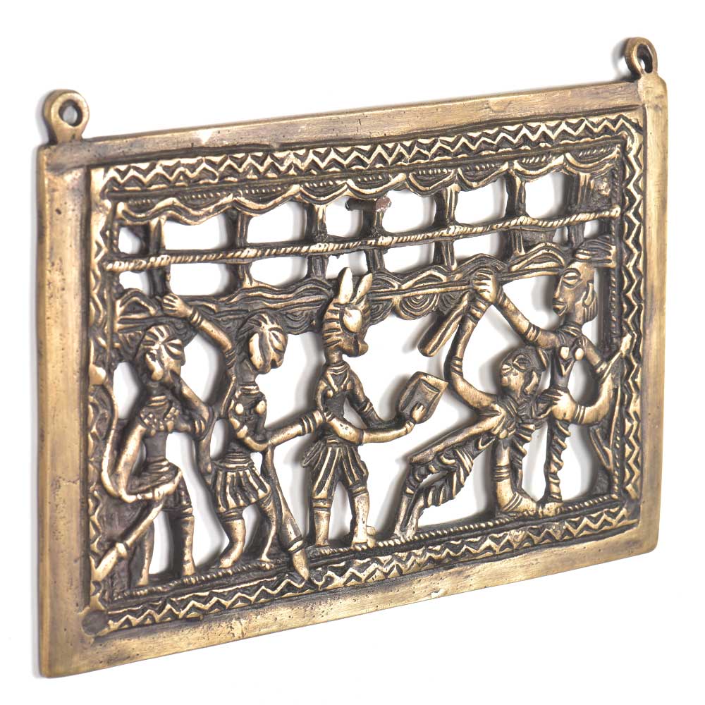 Tribal art wall hanging consisting of 5 tribal people doing something together and it is very made. This wall hanging is made of bronze and is handmade by the local artisans of India. It can be used for gifting, home decoration etc.