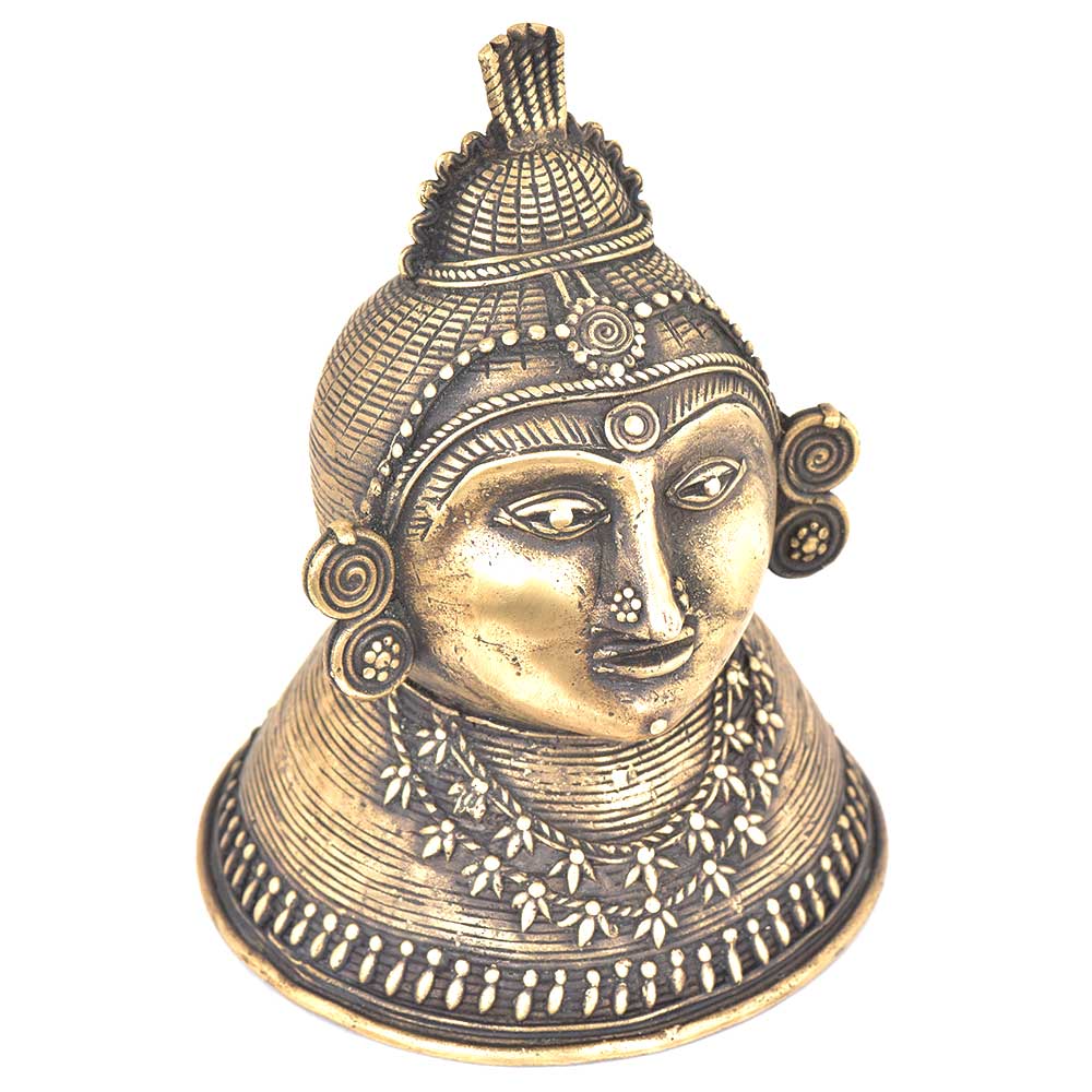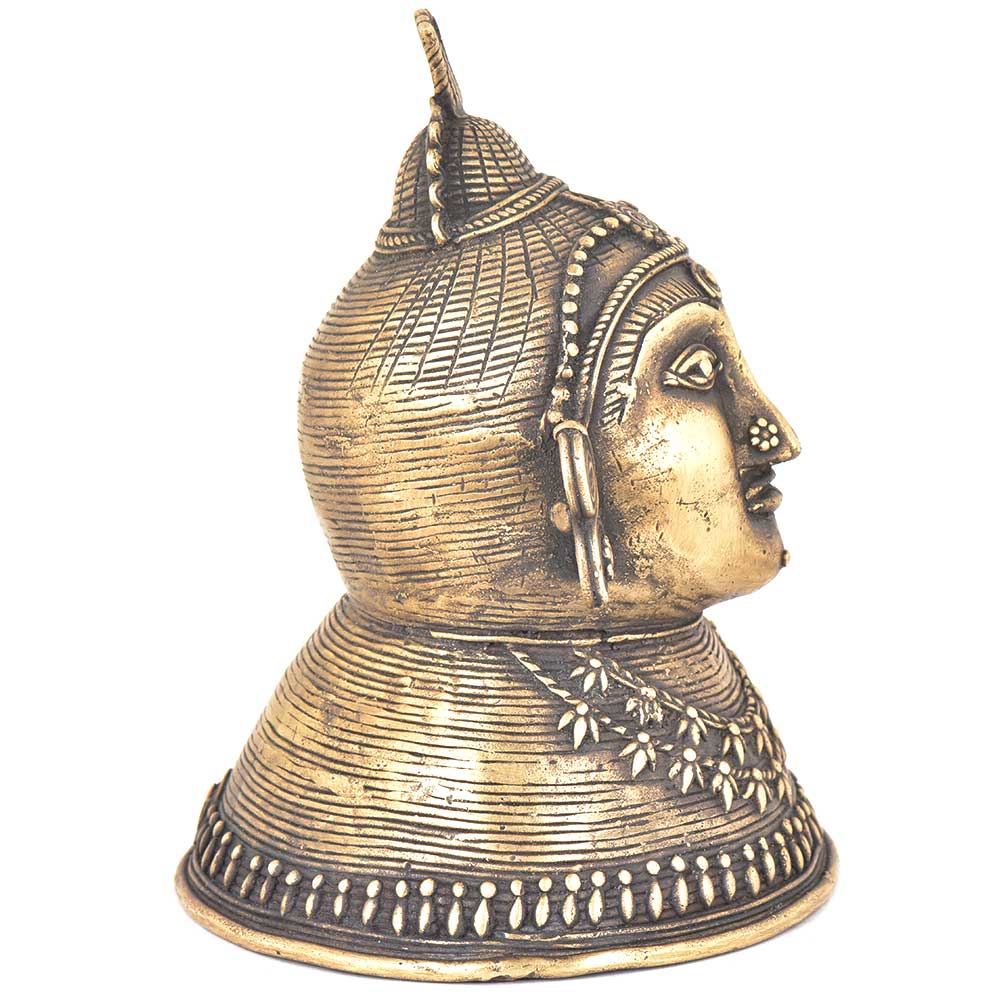 Tribal queen head statue is made of bronze and is handmade by the skilled craftsmen of India. This queen head statue is beautifully ornamented with jewellery. The queen is wearing 2 nose rings, head chain and neck piece. It will look beautiful when placed on tables of your room or drawing room etc. .