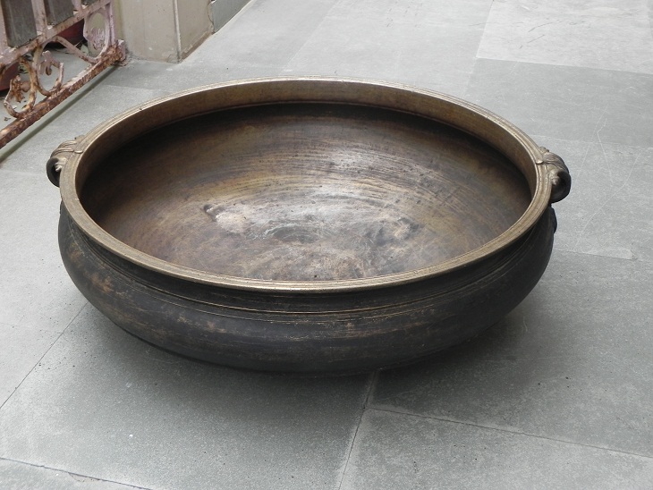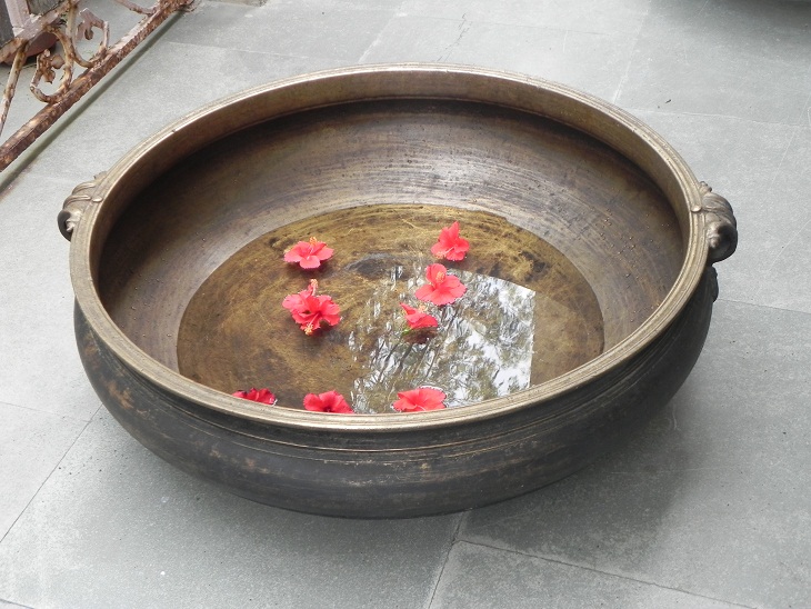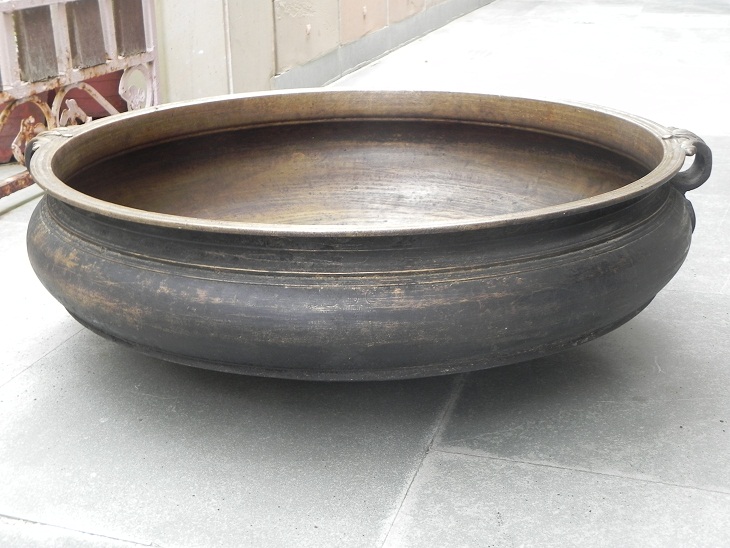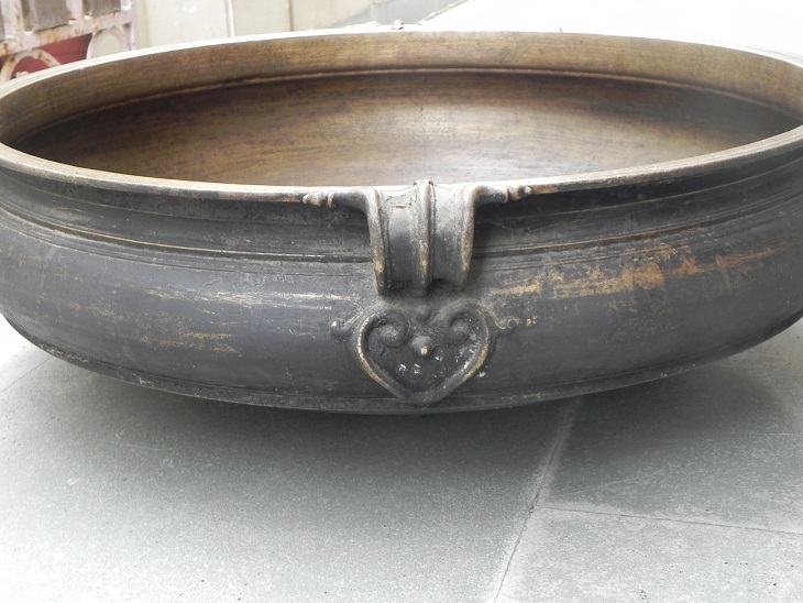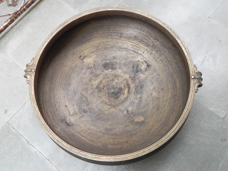 South Indian bronze urli. Made by lost wax process. One of its kind. It was used before to cook food to serve gods and deities. Now it is ideal to put flowers and floating candles and use it as a perfect indoor/outdoor decoration. The beauty of this piece lies in the way of making this piece. This urli is made by lost wax process. Which is completly done by hand. It serves as a beautiful bronze bird bath too.