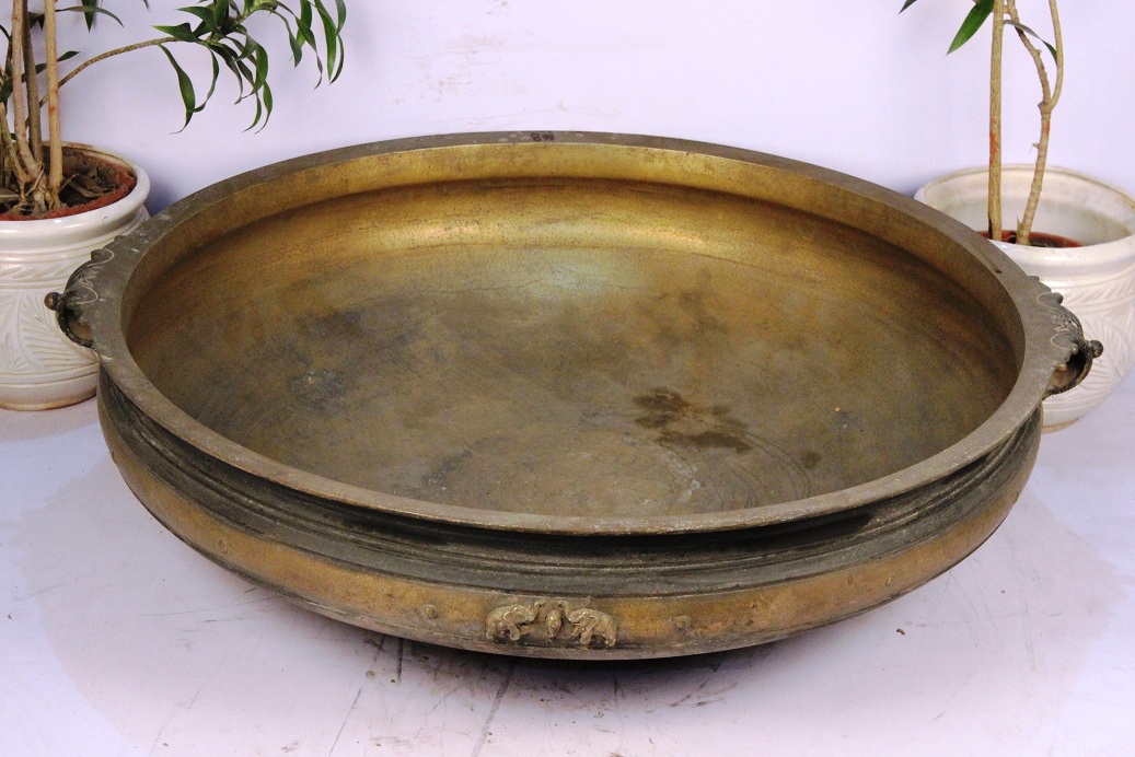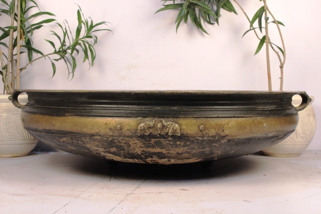 South Indian Bronze Urli Made by Lost Wax Process. One of Its Kind. It Was Used Before in India to Cook Food to Serve Gods and Deities. Now It is Ideal to Put Flowers and Floating Candles and Use It as a Perfect Indoor Decoration. The Beauty of This Piece Lies in the Way of Making This Piece. This Urli is Made by Lost Wax Process. Which is Completely Done by Hand. It Serves as a Beautiful Bronze Bird Bath Too.