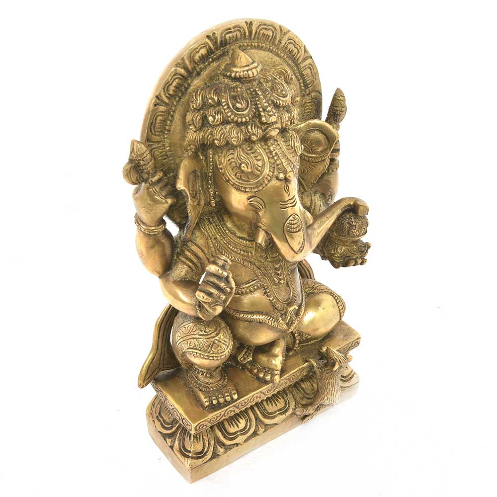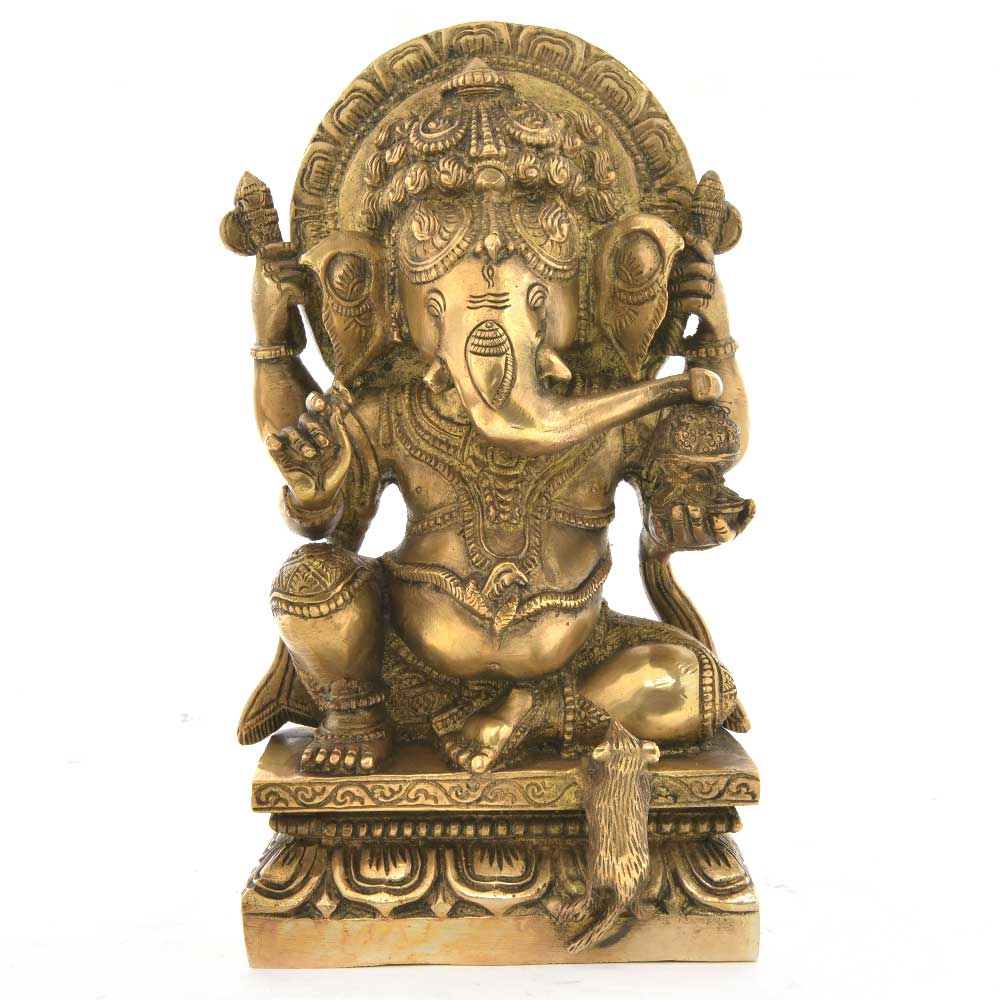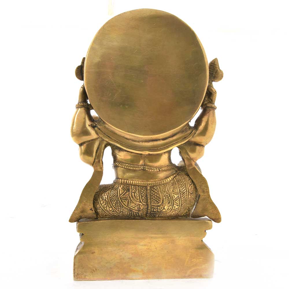 Brass Vinayaka is Sitting on a Raised Platform. The Mushak or Mouse is Trying to Come on the Raised Platform Where He is Unable to Do So. The Brass Vinayaka is Considered as the Remover of Obstacles and Problems From Lives of People. The Vinayaka is Heavily Adorned with Traditional Jewellery, Sitting with Leg Folded. He is the Lord of Wisdom and No Auspicious Work is Complete without Worshipping Him.
