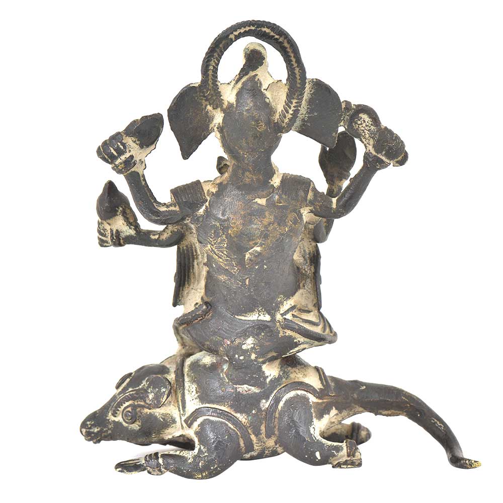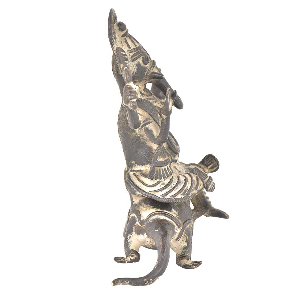 Vintage finishing ganesha sitting on mushak figurine is handmade by the skilled craftsmen of India and this figurine is made of bronze. Ganesha is seated on sitting mushak with his one leg folded and this figurine has beautiful vintage finishing and fine engravings which makes it more attracting. It can be used for gifting, decoration or worshipping.