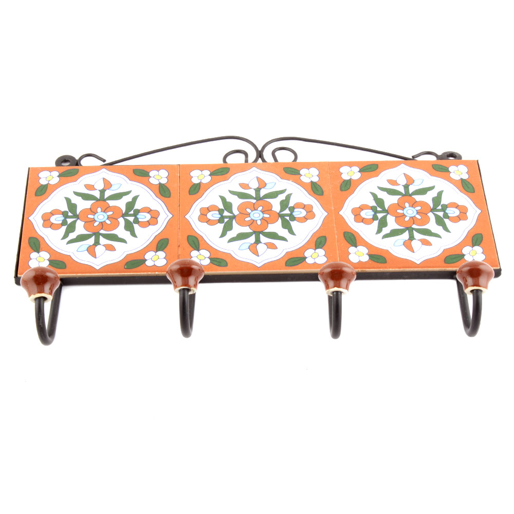 Brown And Forest Green Leaf Flower Tiles Hooks. When Put on Wall or Cabinet it is an Art in itself. The Metal Part of this Hook is Black Powder Coated.