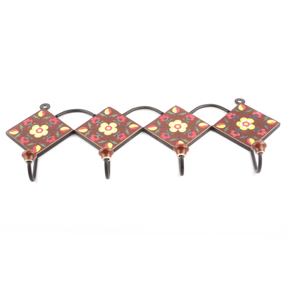 Brown And Yellow Ceramic Floral Tiles Hooks. When Put on Wall or Cabinet It is An Art in Itself. The Metal Part of this Hook is Black Powder Coated.